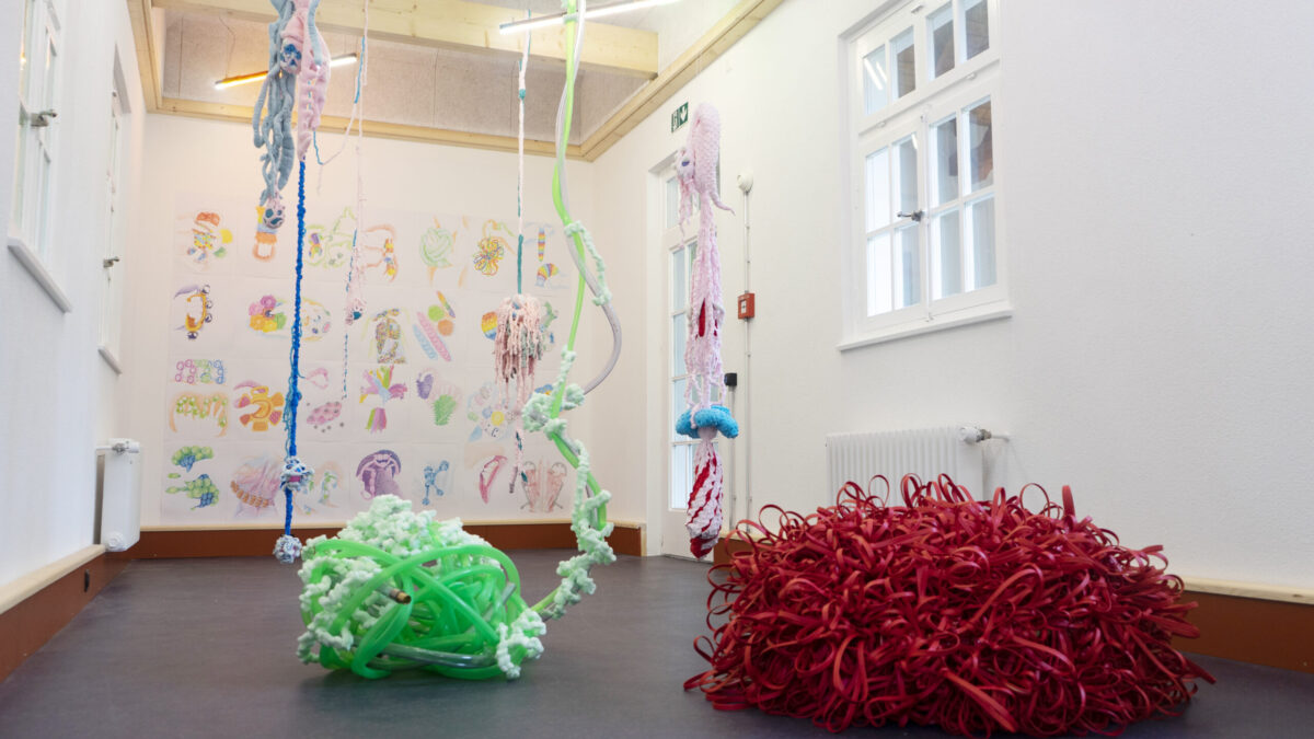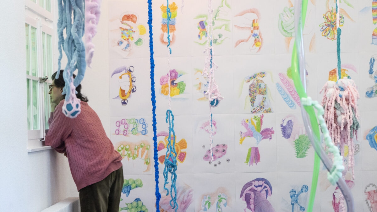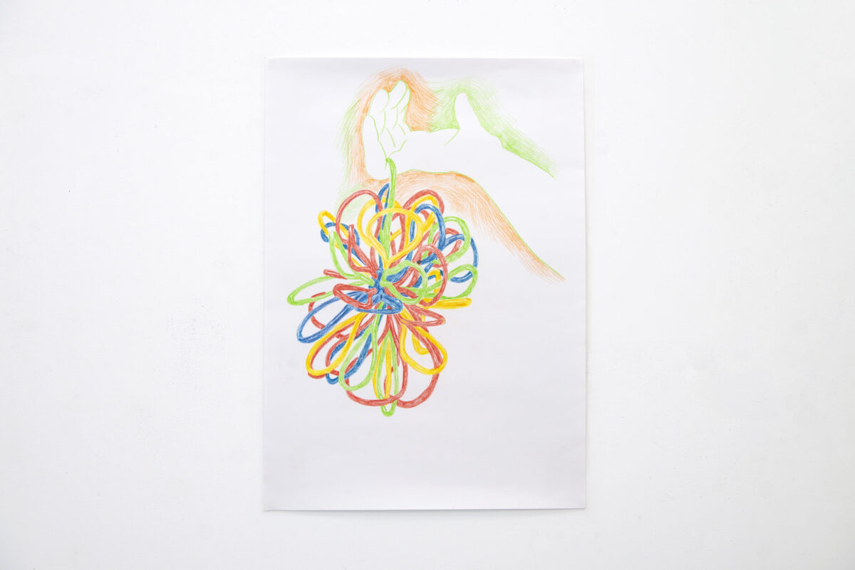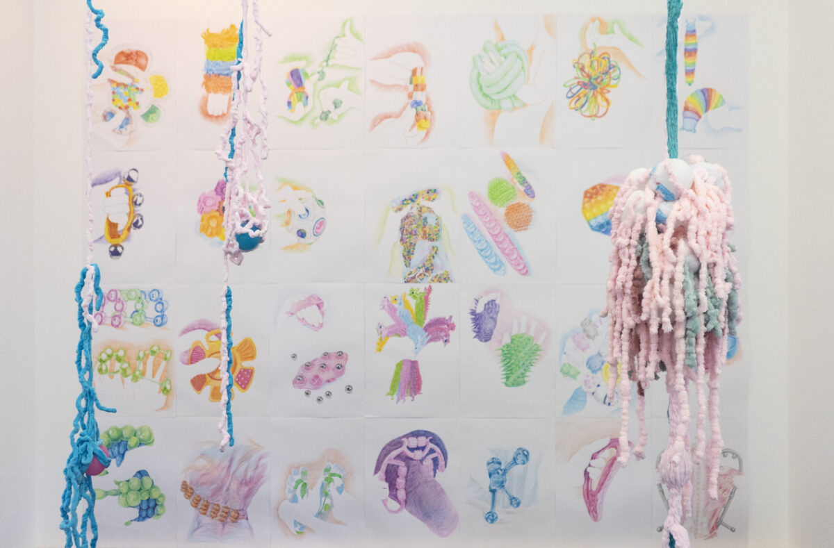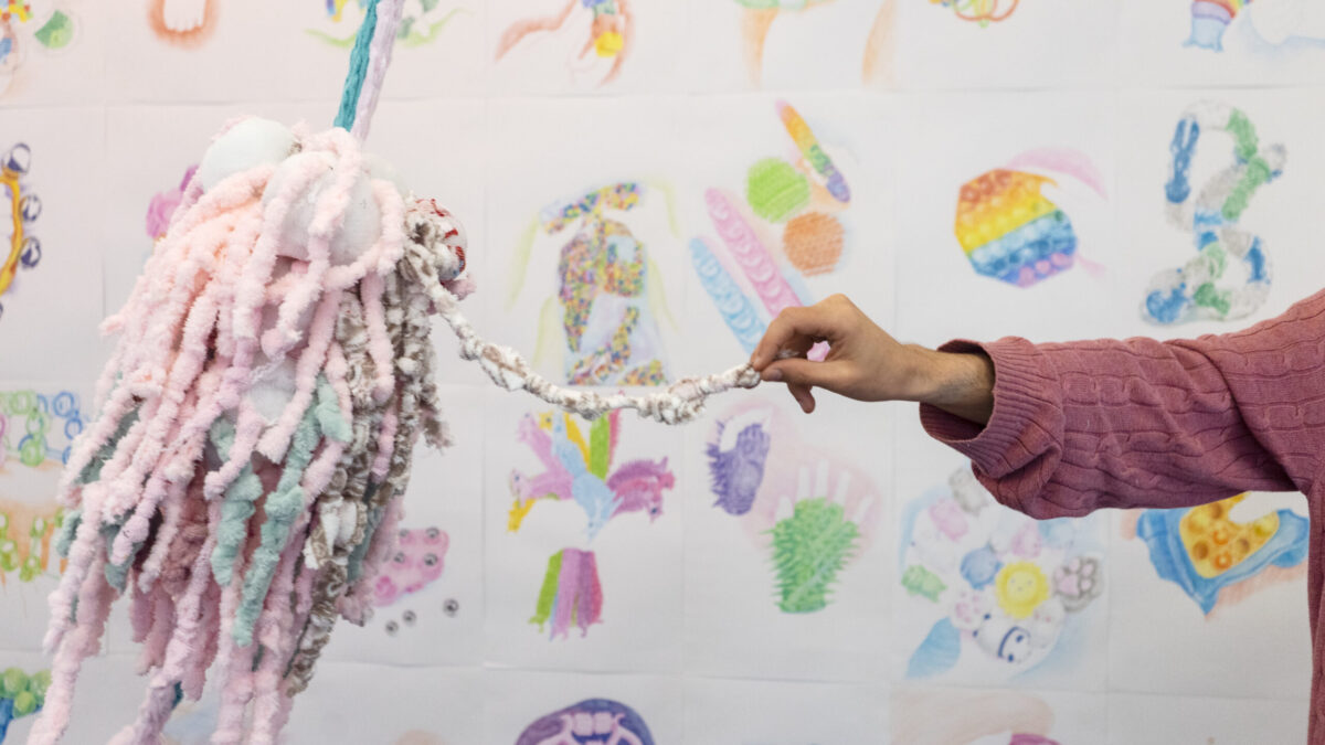 monde saturé d’agitation. À travers une série de dessins colorés et de sculptures textiles intégrant des balles anti-stress, je propose