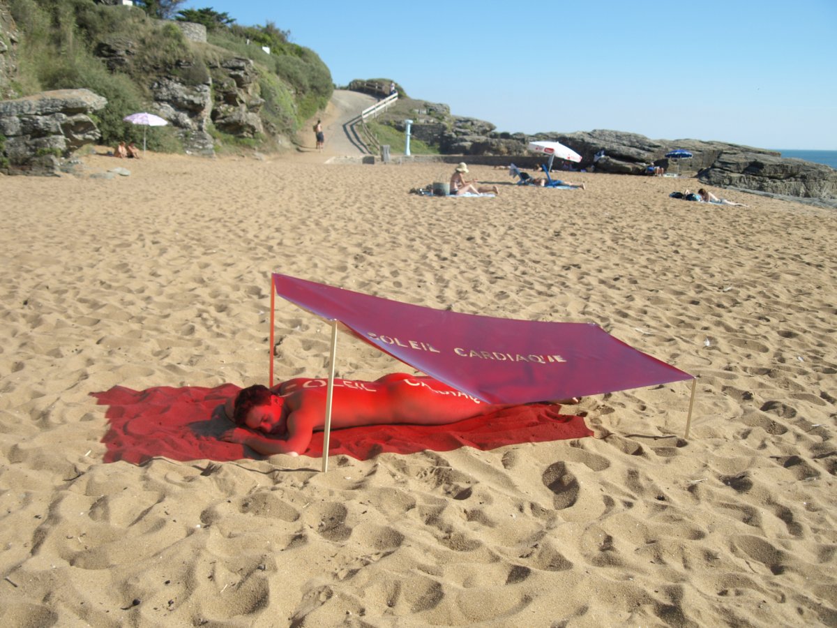 Le titre de la photographie de Laurent Moriceau, collision poétique signée Pierre Giquel, frappe au cœur de l’image. Le corps d’un jeune homme nu, étendu à plat ventre à même le sable d’une plage, est protégé d’un dispositif étrange, dais de gélatine rouge évidé en son centre de ce message énigmatique : SOLEIL CARDIAQUE. En positif, le soleil imprime sa marque sur la peau baignée de lumière inactinique, découpant les contours d’un tatouage à « libération prolongée » qui nous plonge aux sources des préoccupations de l’artiste. Le rapport au corps est manifestement essentiel dans cette proposition. Laurent Moriceau y prolonge sa réflexion sur les potentialités fantasmatiques de la photosensibilité développées avec la pièce K-shirt, où il glisse du papier sensible entre les sous-vêtements d’une femme et sa peau puis le laisse s’impressionner. Le projet des Perméables peut se lire comme un rêve éveillé similaire, où le papier photo serait prolongement de la peau. Avec Soleil cardiaque, l’épiderme est à nouveau support de révélation : si l’artiste revisite la technique primitive du photogramme, il met surtout en jeu le processus de fabrication de l’image — sa mise en suspens — sans s’attacher à montrer la littéralité d’un résultat. C’est plutôt la métaphore d’un désir scopique dévorant qui est ici représentée, quand l’impression photographique s’envisage comme une caresse brûlante. Dans ce paysage balnéaire assez commun surgit alors la forte probabilité d’une érotisation du réel : un soleil cardiaque, une irradiation des sens. Le présage d’une palpitation accélérée.
