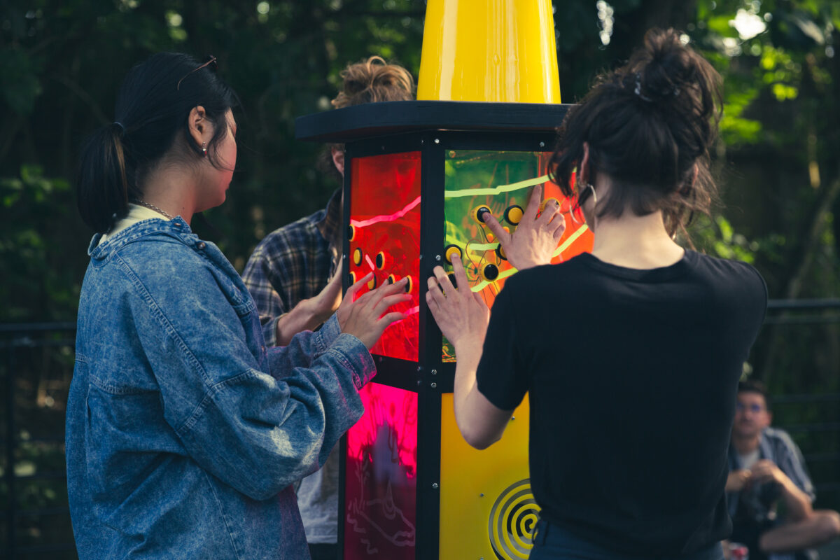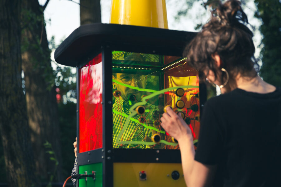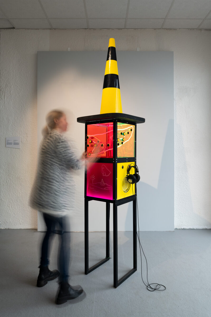 Soundtrack of an Island est une œuvre multimédia conçue comme une sculpture sonore interactive. Elle restitue des sons modifiés issus d’enregistrements réalisés sur l’île de Nantes. Les visiteur.euse.s peuvent l’utiliser comme un jeu d’arcade pour composer une bande sonore. Visuellement, cette sculpture évoque un avatar de jeu vidéo, un PNJ guidant les joueurs à travers une histoire. Son « plot » sur la tête lui confère une allure de magicien, tandis que ses composants électroniques, visibles à l’intérieur de son corps, rappellent des organes technologiques. En interagissant avec elle, les visiteur.euse.s peuvent écouter des interviews sur l’histoire de l’île de Nantes.