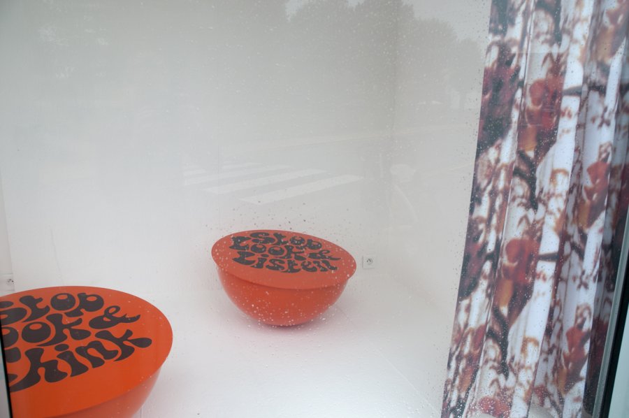 Un badge de la sécurité routière avec l’inscription Stop look & listen before crossing the road (Arrêtez vous, regardez et écoutez avant de traverser) a été le point de départ d’une série jouant sur l’idée de déclinaison. La fiction vient de la mise à distance, de la recomposition, du glissement de contexte et de sens. Elle se matérialise par des jeux de changements d’échelles, un détournement de fonctions… Ces mots interpellent, ils sont une invitation à faire une pause, à se questionner, à rêver.