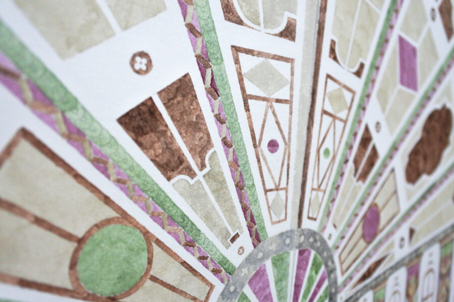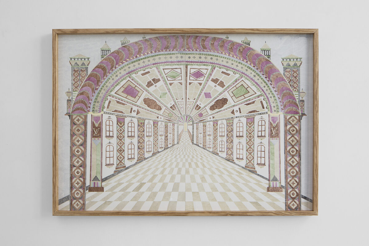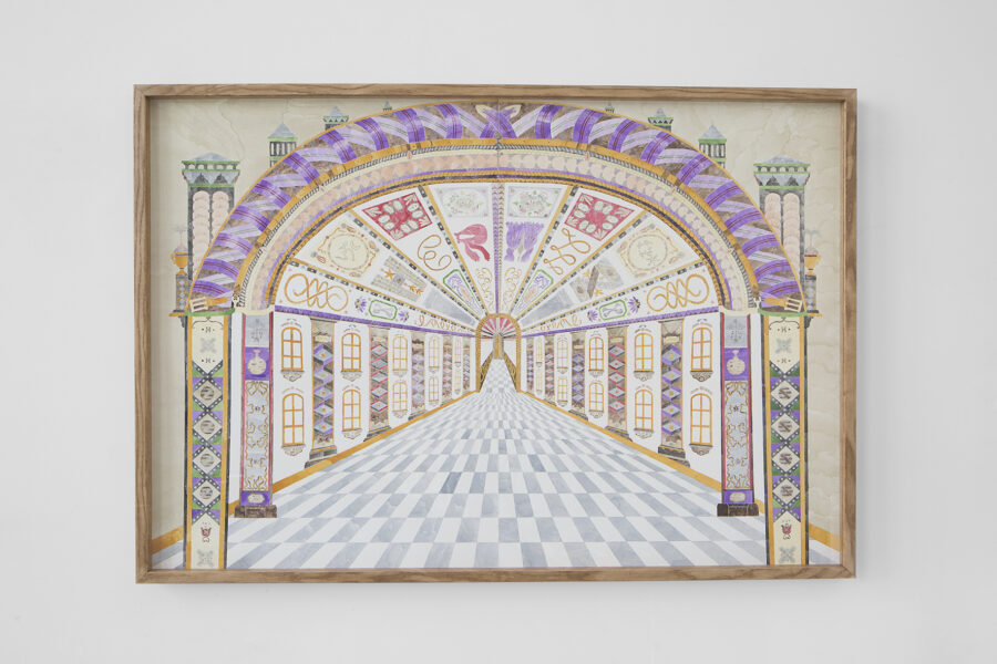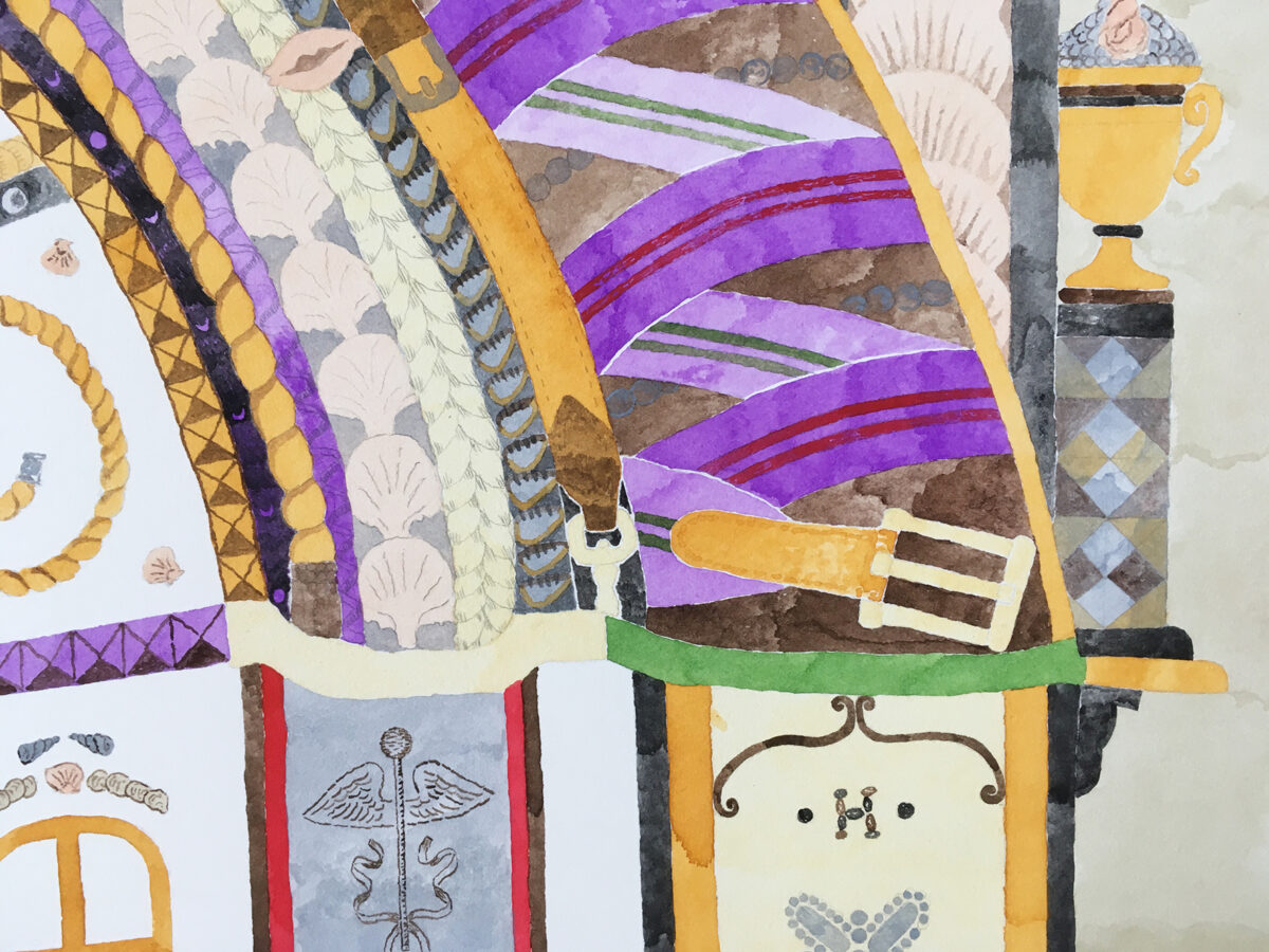 Gouache et crayon sur papier aquarelle. Cadre en frêne teinté brou de noix. Gouache sur pâte-à-modeler 76 × 112 cm Le Grand Huit Nantes