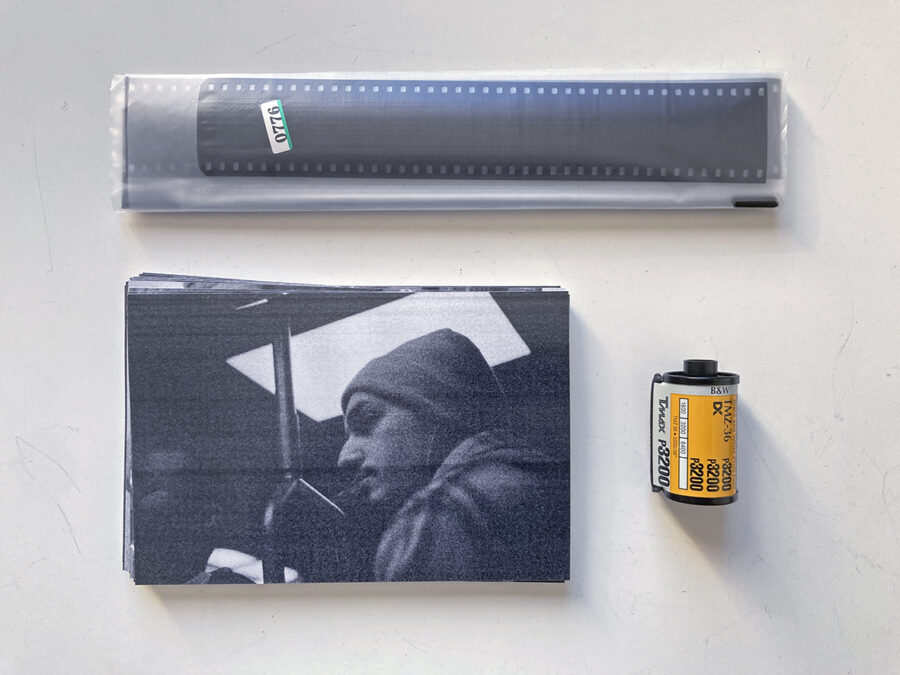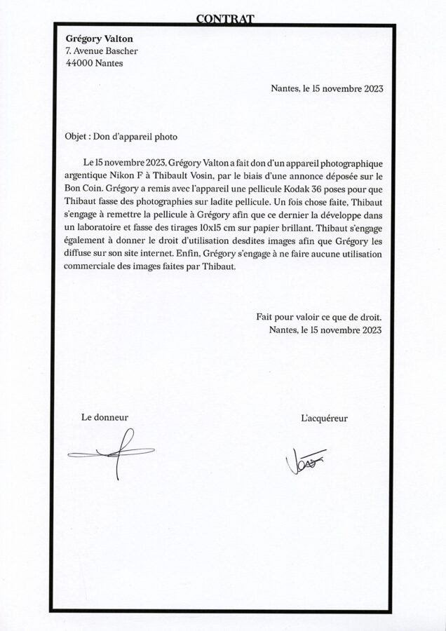 Enfin, Thibaut arrive et je lui explique l’histoire de l’appareil. J’ai imprimé un contrat stipulant que je donne l’appareil avec une pellicule noir et blanc Tmax 3200, mais qu’en contre-partie, Thibaut doit photographier avec ce film et me le remettre le jeudi 11 avril 2024.
