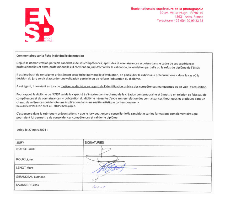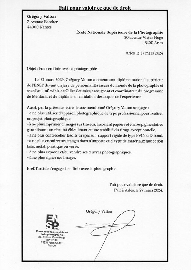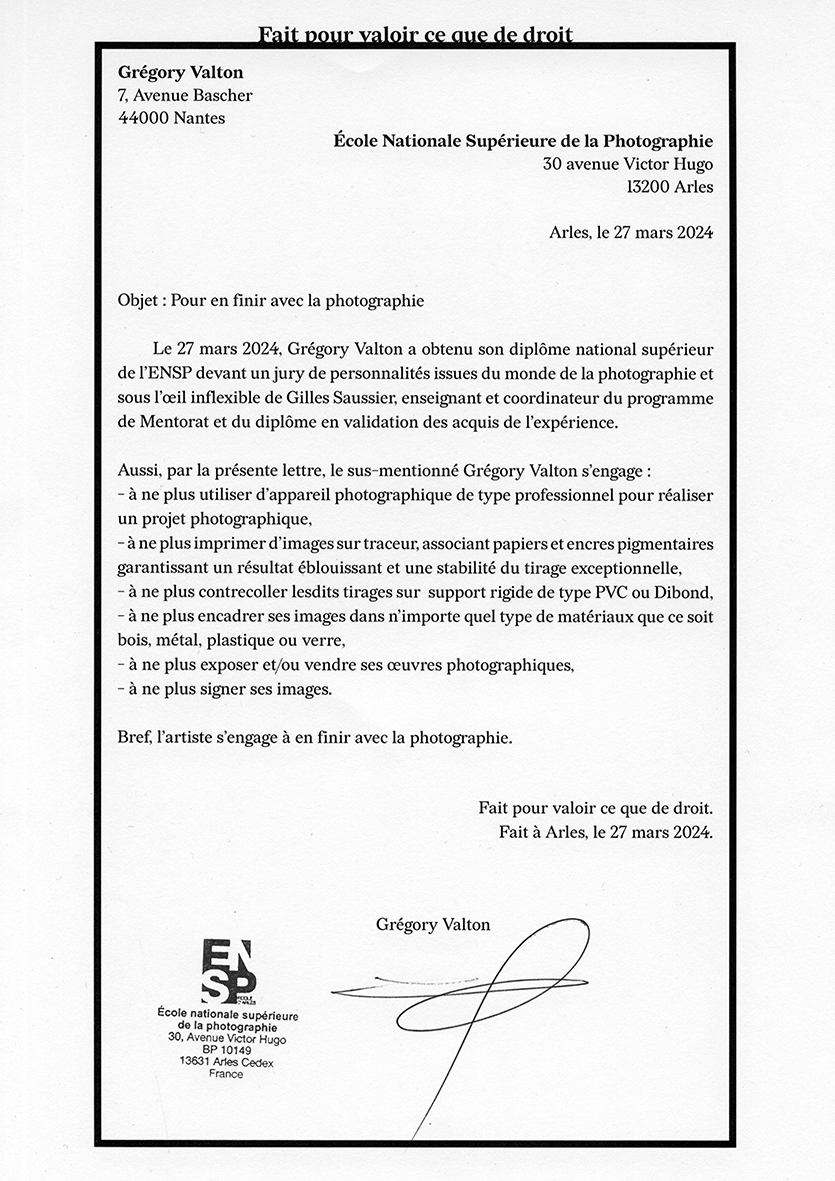 Le mercredi 27 mars 2024 à 15h30, je passe devant un jury pour obtenir un diplôme de l’École National Supérieur de la Photographie (ENSP) à Arles. Vers 16h45, le jury me fait savoir que je suis apte à faire parti de la grande famille des photographes, grâce à l’obtention avec mention de mon diplôme. En sortant, je signe un contrat avec moi-même dont l’objet est : « Pour en finir avec la photographie ».