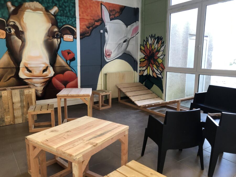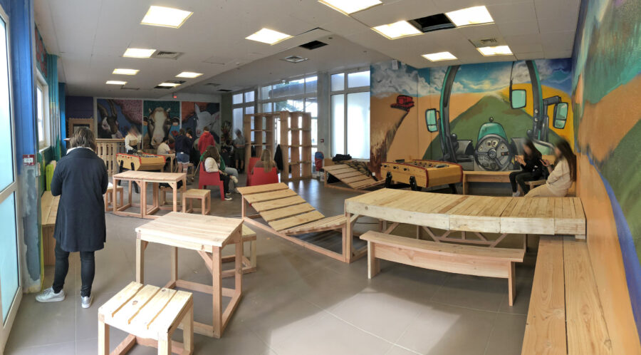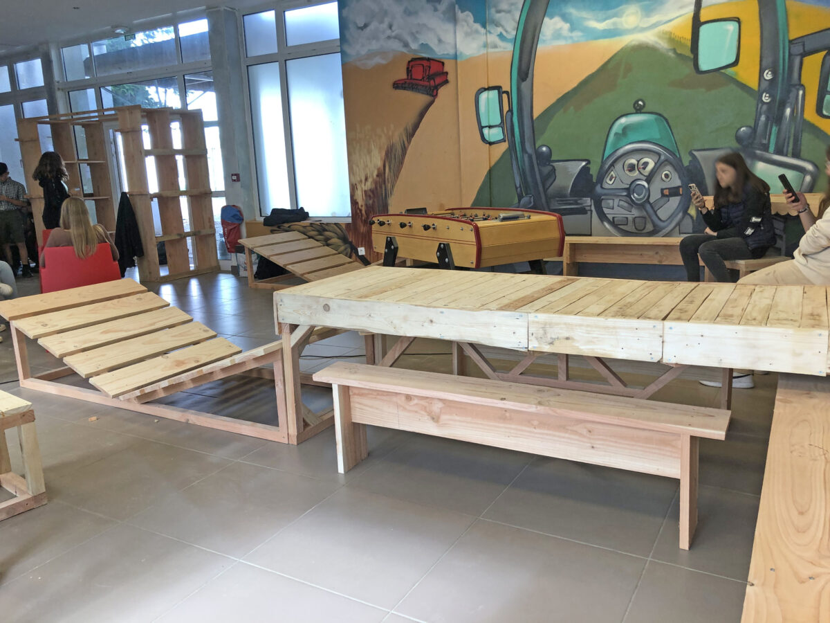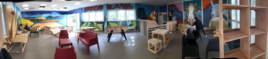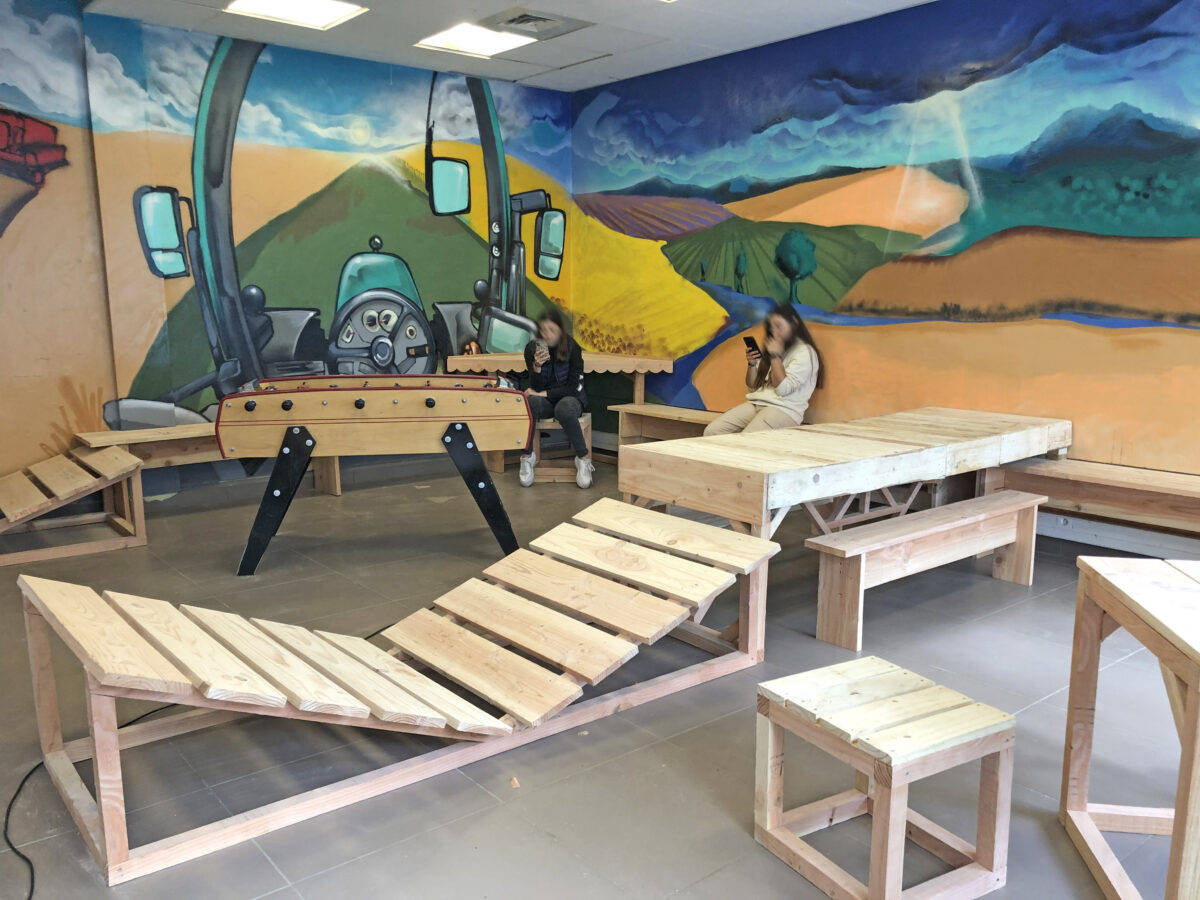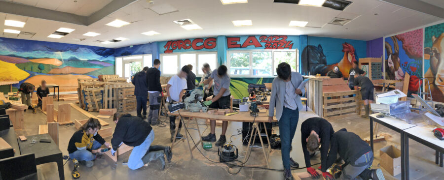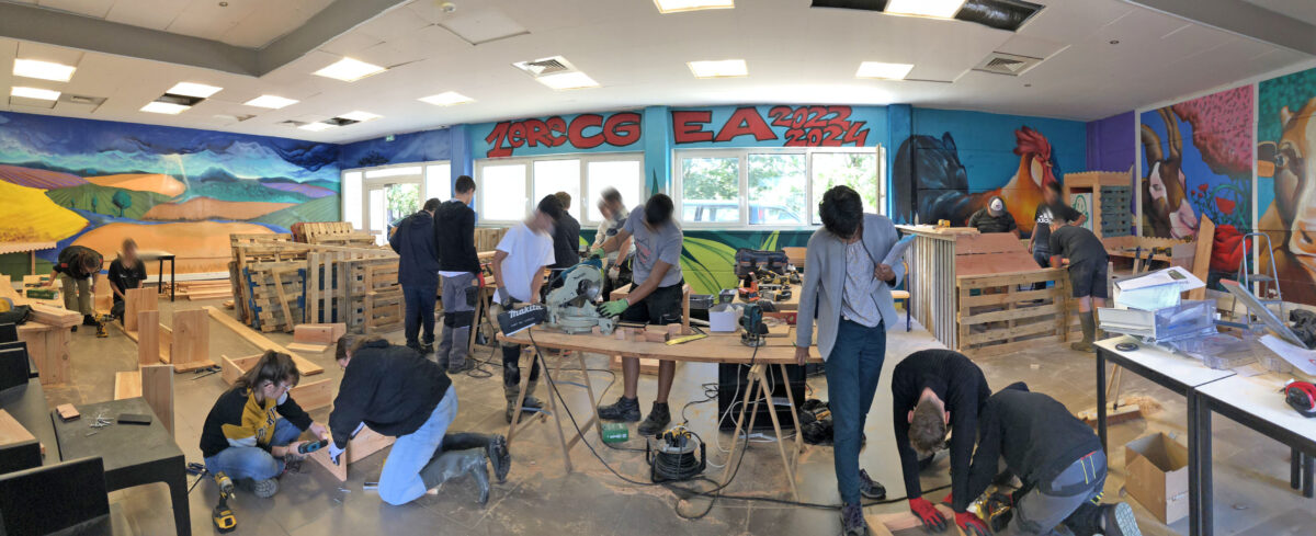 Un nouveau foyer à l’image des élèves, tout en leur proposant et de le penser et de le construire. En plus de leur avoir apporté des notions d’esthétisme, de design, d’architecture et de conception, ce dispositif a permis ici de créer un lieu pensé par eux, construit par et pour eux, ce qui leur amènera une nouvelle façon de vivre ce lieu. Design graf# Monsieur Plume, Design Mobilier# Lucas Grandin. Un Grand Bravo à la classe de 1ere CGEA 2023/24 encadrée par Delphine Lefeuvre. Un projet financé par « Aux arts » Lycéens Apprentis.