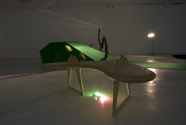 Table basse dont le plateau est un boomerang très massif, perché sur deux pieds fragiles.