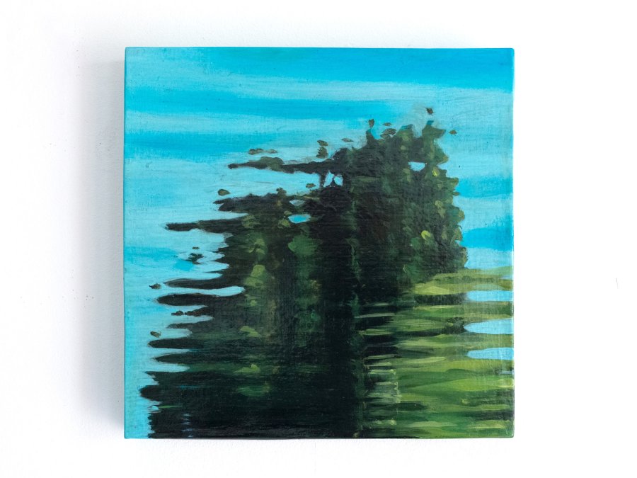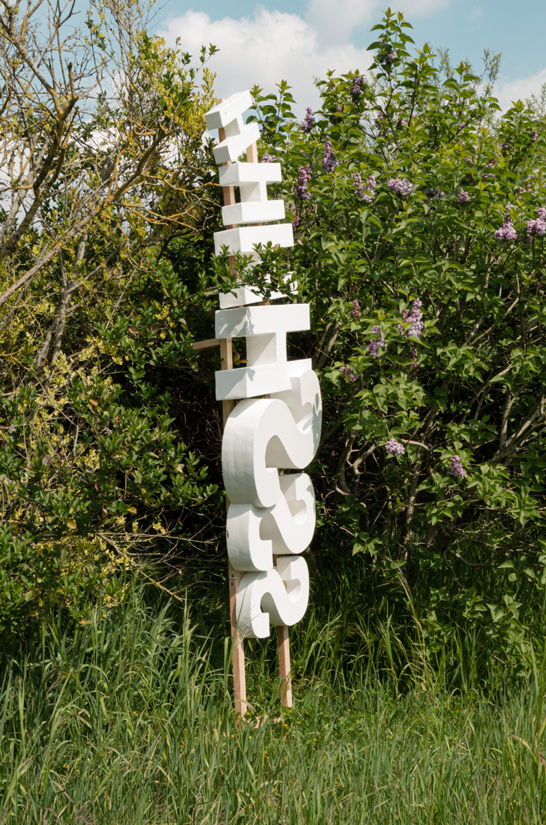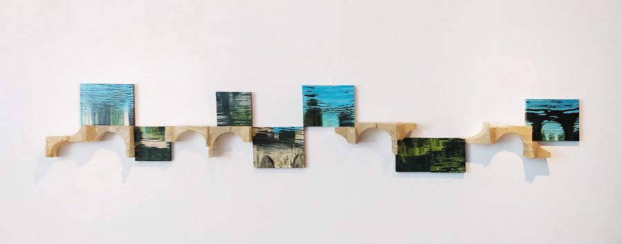 Fixer ce qui toujours est changeant : des peintures, à vouloir représenter fidèlement l’impermanence fluide des reflets sur la rivière, en deviennent abstraites et les ponts de Limoges qu’elles figurent, difficilement reconnaissables. À côté d’eux, tels des souvenirs imprécis, des volumes composés à partir d’éléments architecturaux pris à ces mêmes ponts, échouent à nous faire nous remémorer leurs formes ou l’ordre de leur position. Ailleurs d’autres objets, au croisement de l’enseigne et de l’onomatopée, destinés à être posés ou portés, prétendent donner une forme visible au bruissement des feuillages ou aux éclats des voix mouillés d’embruns et emportés par le vent.