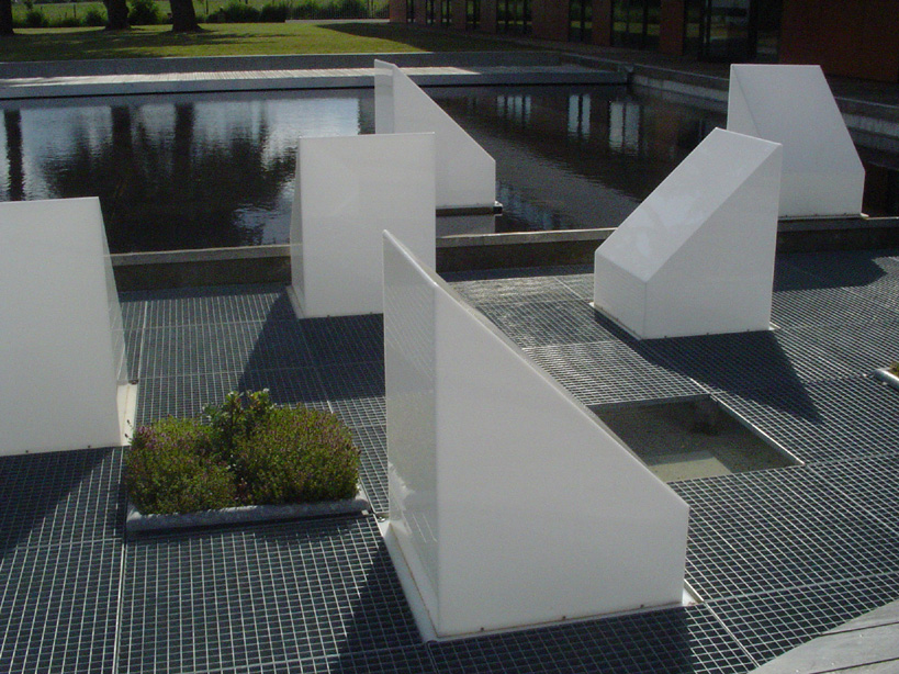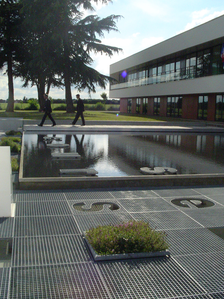 bassins mis en eau, franchissables par une passerelle en bois et en partie recouverts de caillebotis où s’enchâssent des bacs