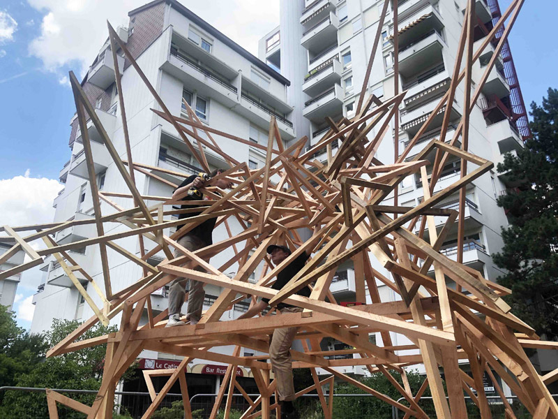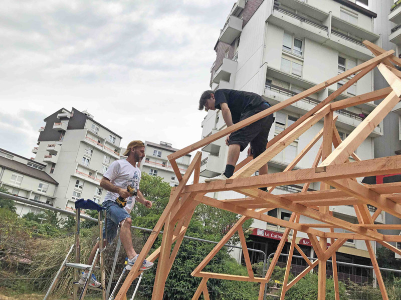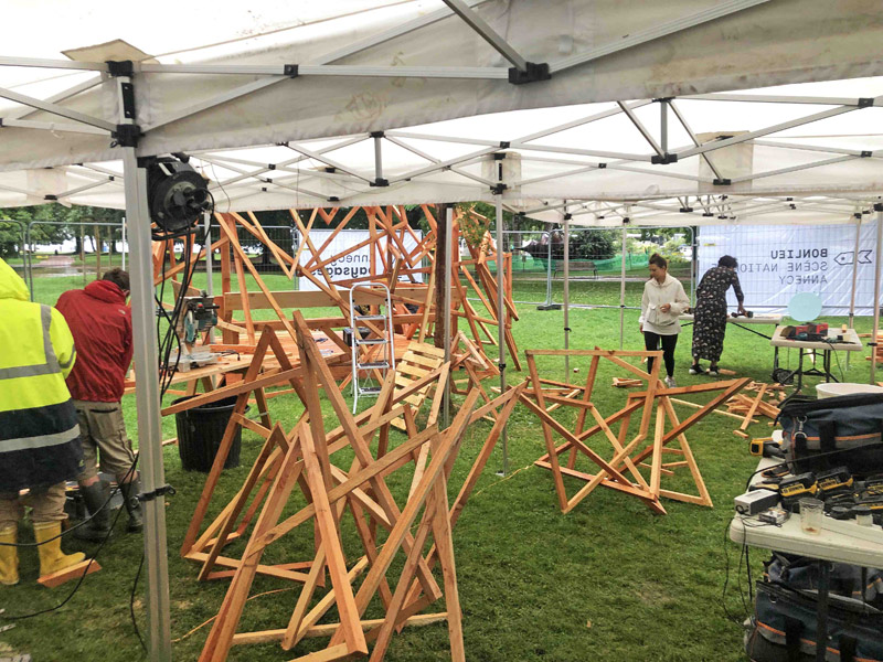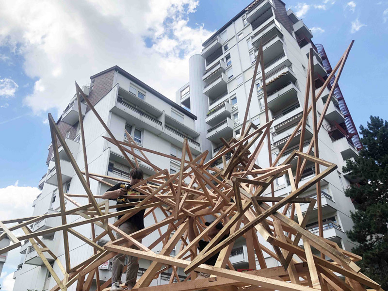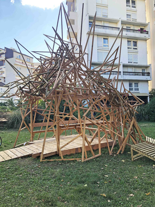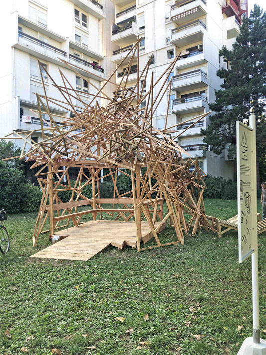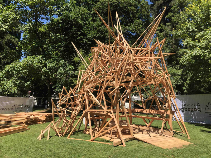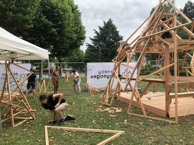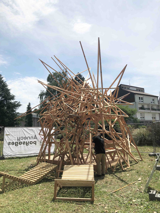Création dans le cadre de ma résidence au lieu d’art contemporain Le Mikado, Annecy. Tectogenèse(s), structures jumelles construites avec les habitants de Annecy, Le Mikado, Annecy-Paysages