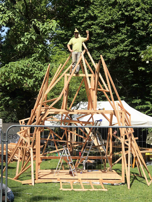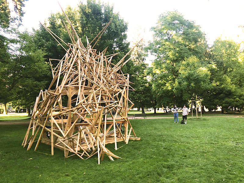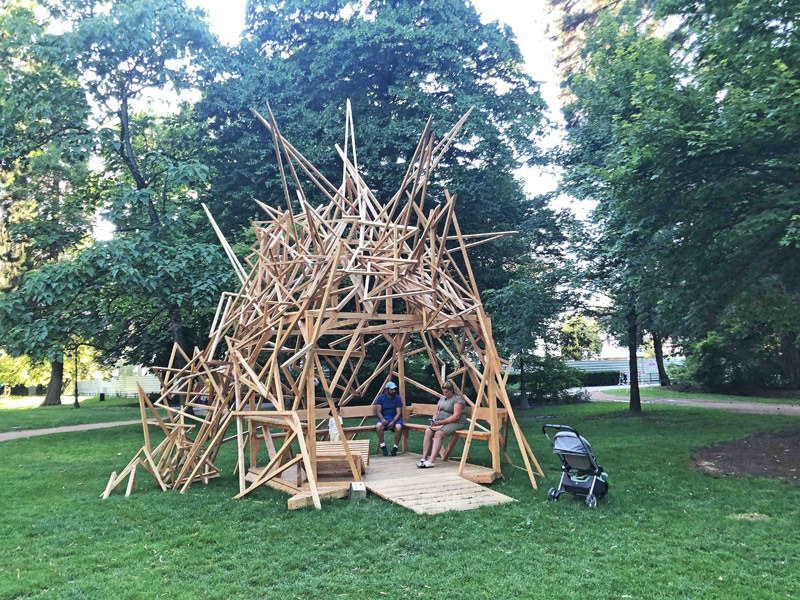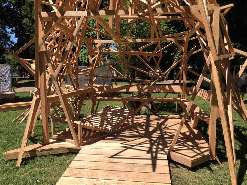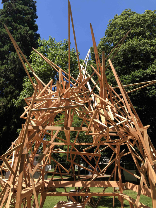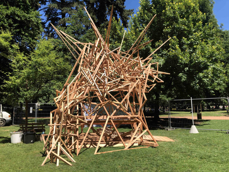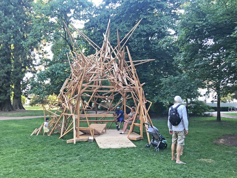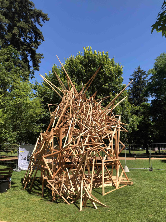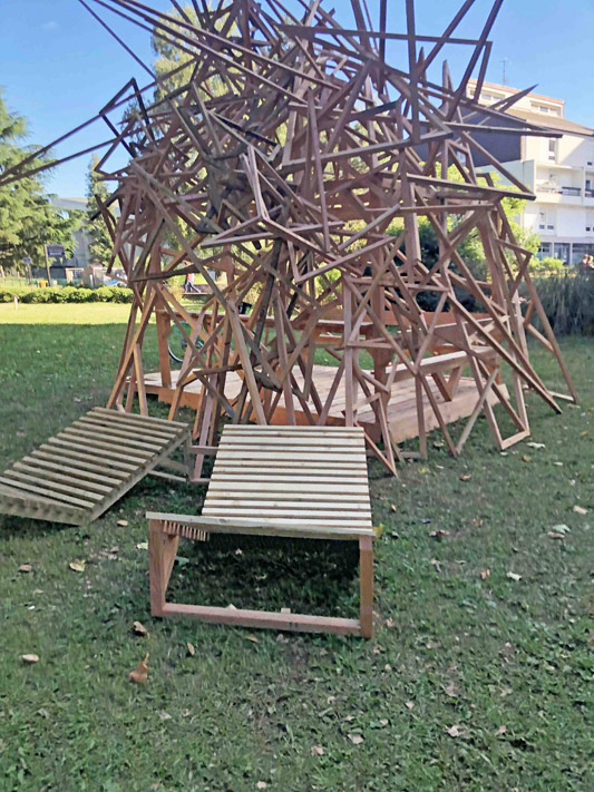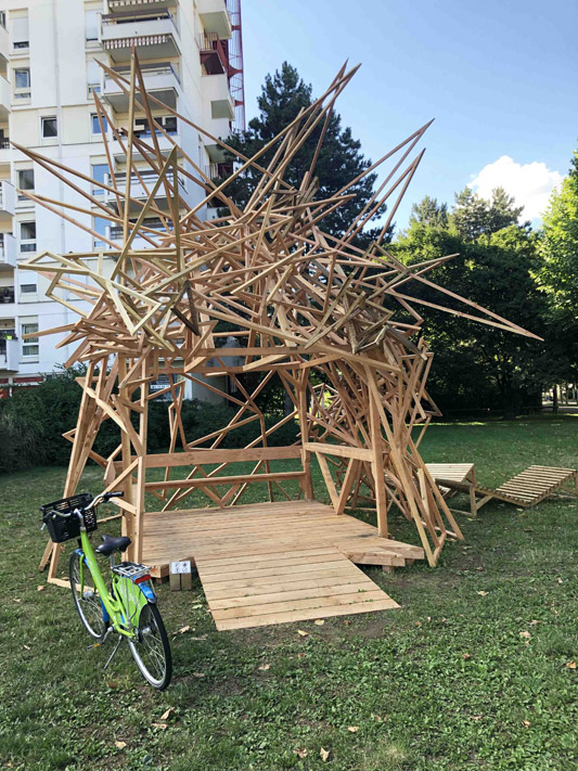 Création dans le cadre de ma résidence au lieu d’art contemporain Le Mikado, Annecy. Tectogenèse(s), structures jumelles construites avec les habitants de Annecy, Le Mikado, Annecy-Paysages
