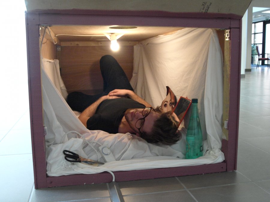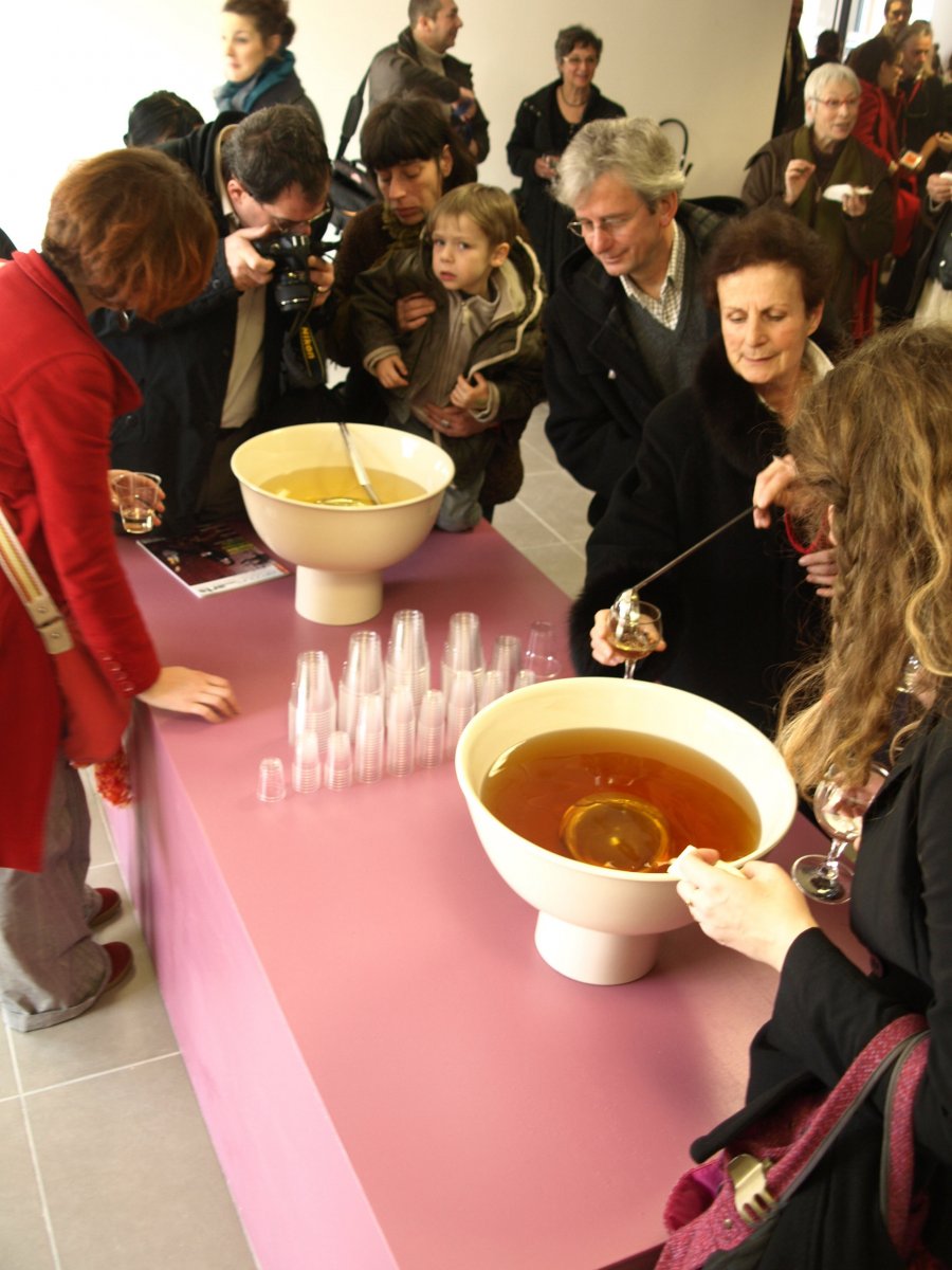 La proposition de Têtes à têtes propose en premier lieu un changement d’échelle du dispositif optique des verres à saké pour littéralement ouvrir de multiples perspectives. La bille de verre est devenue boule de cristal, permettant à plusieurs personnes de découvrir ensemble une même représentation. En outre, bien que cela ne soit pas immédiatement appréhendable, sous la table-support de Têtes à têtes se joue une scène, et l’imaginaire peut s’immiscer entre la personne venue simplement se servir un verre et les apparitions intrigantes qui surgissent soudain au fond de celui-ci.