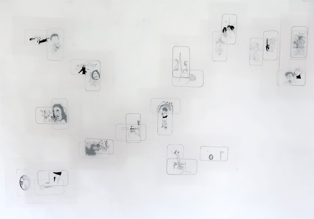 Les souvenirs s’envolent, comme des oiseaux migrateurs, vers le ciel d’Internet. Je tente par le tracé à l’encre, sur des feuilles de papier calque, de matérialiser ce flux d’images, nos traces photographiques qui se chevauchent, se superposent. C’est une zone d’apparitions et de disparitions, où tout n’est que fragment. Sur chaque dessin, le même contour noir apparaît, qui évoque aussi bien un cartouche égyptien que l’empreinte d’un smartphone.