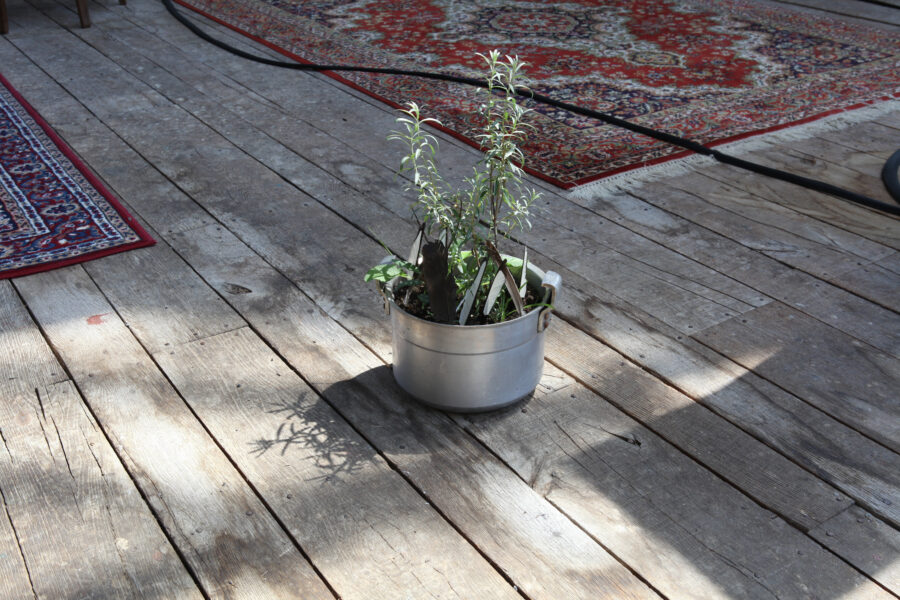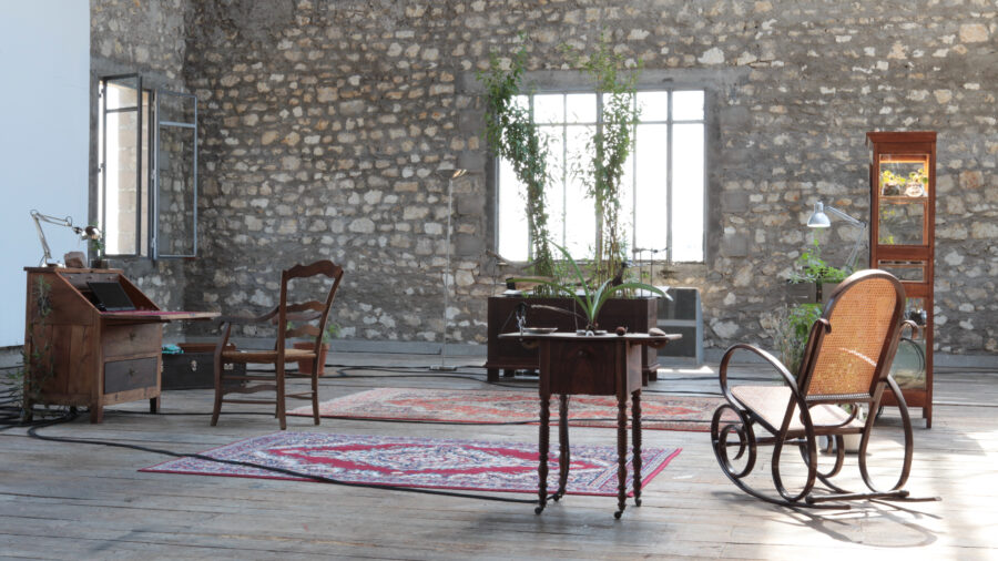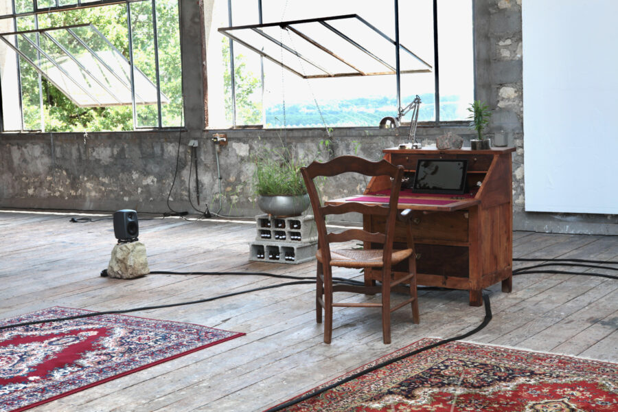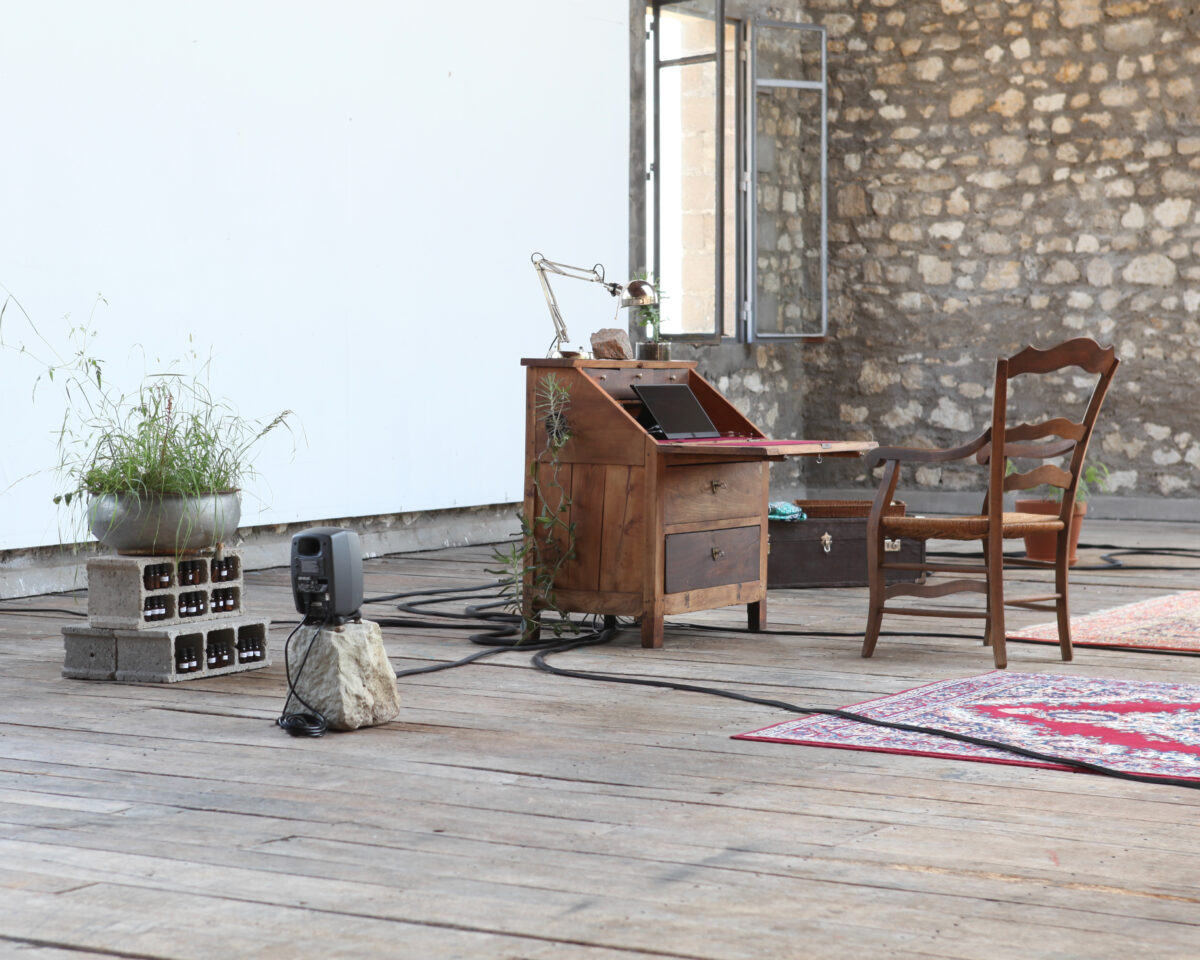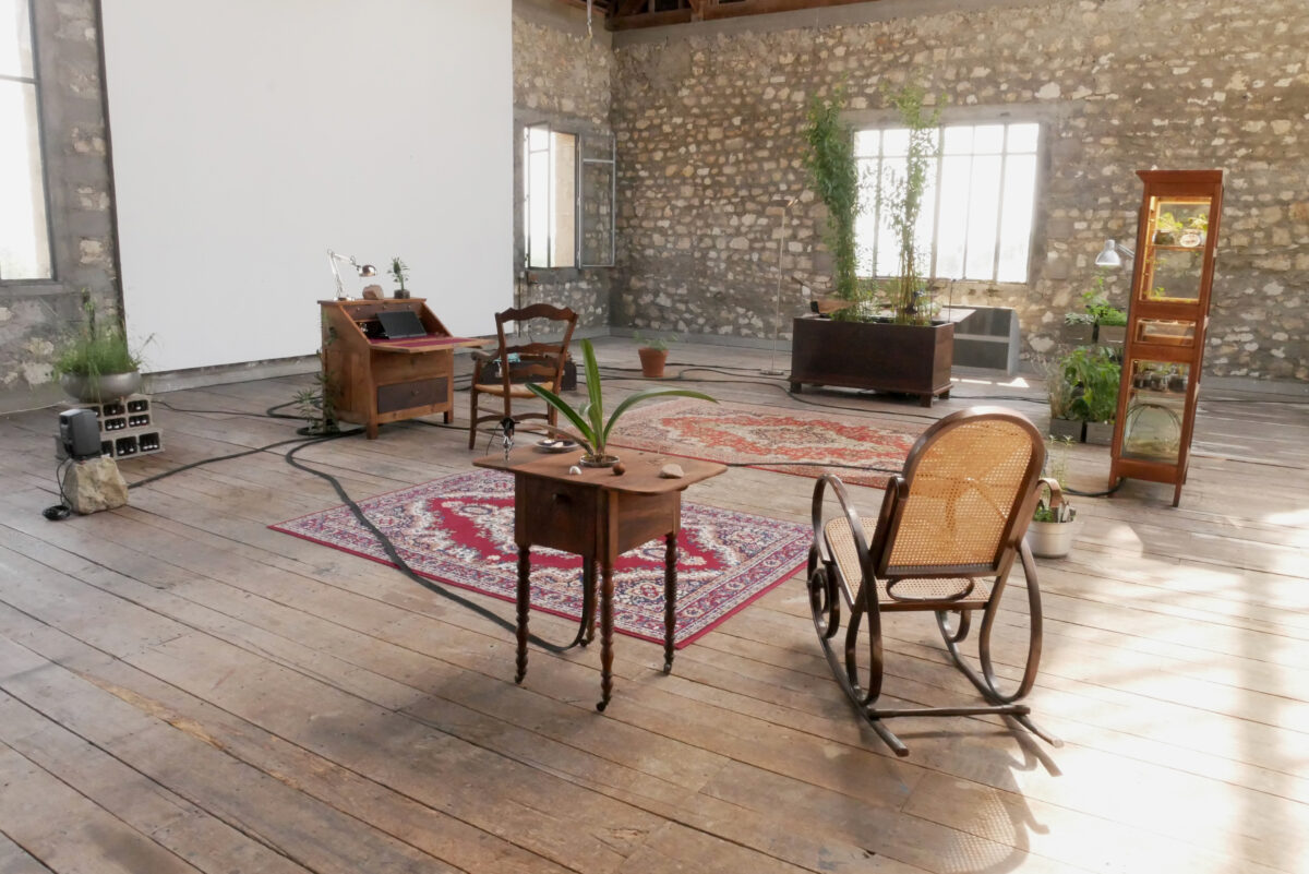 Incorporé dans le mobilier, un écosystème électronique contribue à créer une porosité entre les paysages afin de les donner à voir et à entendre sous différentes échelles. Au travers de ces objets, transparais des sons animal ou végétal, et de matériaux naturels, tout issus du territoire. Cette mixité de végétaux, d’objets et de sons dresse une scène vivante, mouvante et animée.