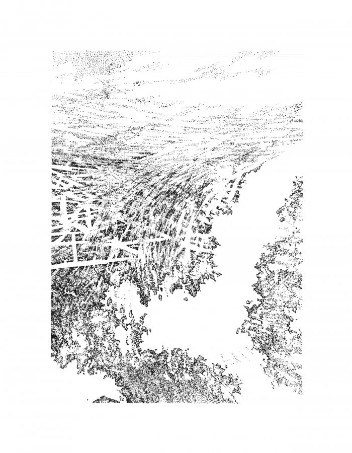 J’ai disposé mes feuilles au sol et j’allais de l’une à l’autre, retraçant en pointillé ce qui me restait en mémoire des paysages parcourus. Ma mémoire sédimentée venait se déposer sur le papier. J’ai travaillé par couche, par strates de niveaux de gris, en gardant des réserves de blanc pour la lumière.