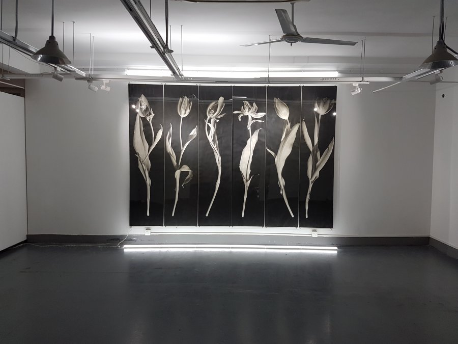 À la manière d’un Rayogramme, image photographique obtenue sans appareil photo, Justin Weiler a peint, à l’encre de Chine, une tulipe à différentes étapes de décomposition, pour ne pas oublier que le temps passe trop vite. C’est une succession d’images, placées dans un écrin. Elles sont encadrées sous plexiglass et éclairées comme des panneaux publicitaires. Ces tulipes deviennent précieuses, comme chez les Flamands du 17ème siècle où la tulipe fût une des causes de la première bulle spéculative. Au plus fort de la crise un bulbe de Semper Augustus équivalait à quinze fois le salaire annuel moyen d’un artisan. Une ambiguïté existe entre l’objet médiatique, publicitaire et la préciosité de l’objet. Mais également entre cet ancien objet de spéculation qui devient œuvre et qui à son tour pourrait devenir objet de spéculation.