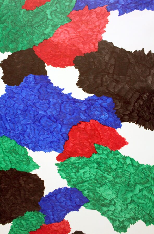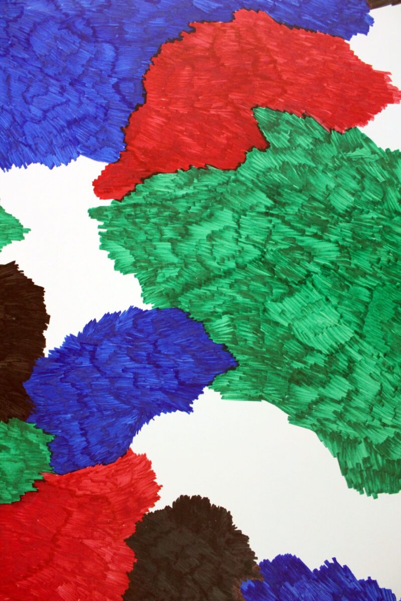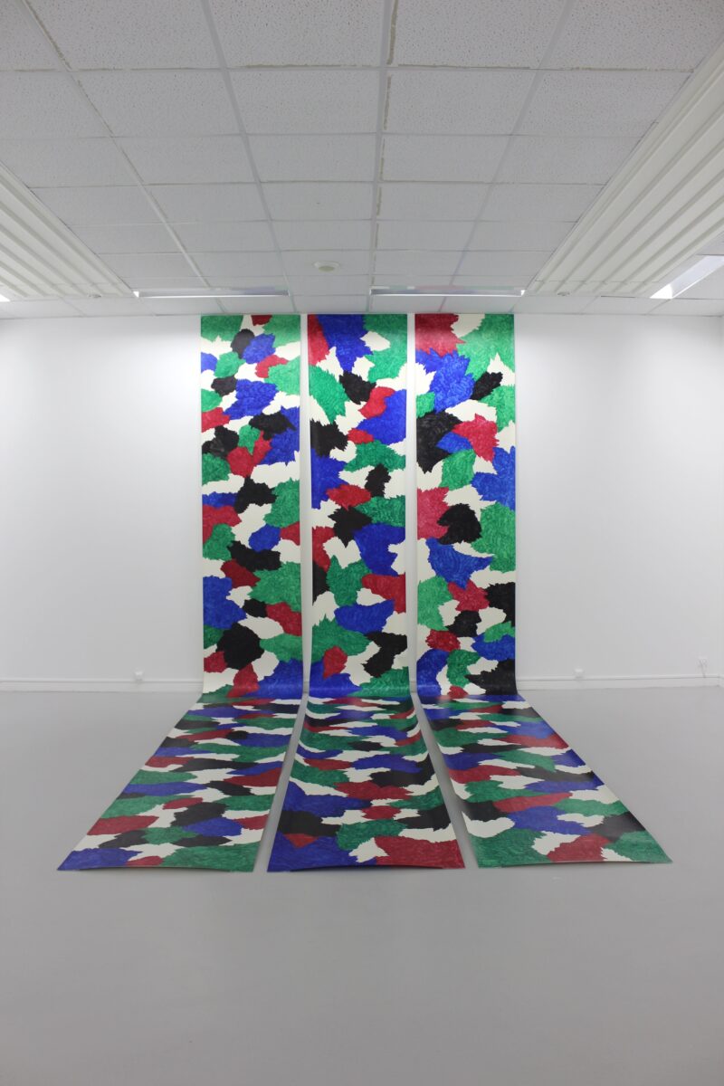Marqueur sur papier, trois dessins de 85 x 700 cm, co-production le Lieu Unique de Nantes et le Site-Saint-Sauveur, Rocheservière, Terres de Montaigu vues de l’exposition "Géantes", Centre des Arts André Malraux, Douarnenez, 2024 © Adagp, Paris, 2024 invited by Centre des Arts André Malraux