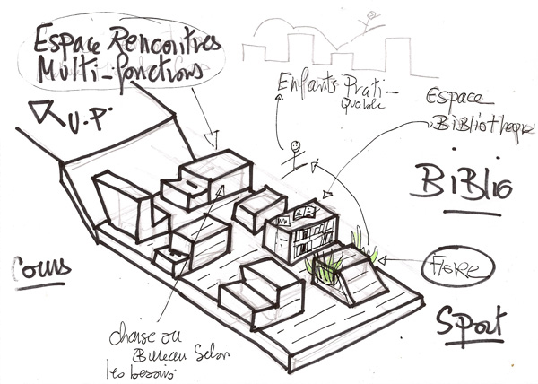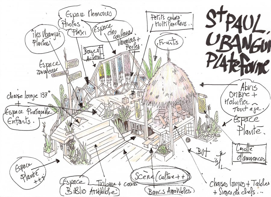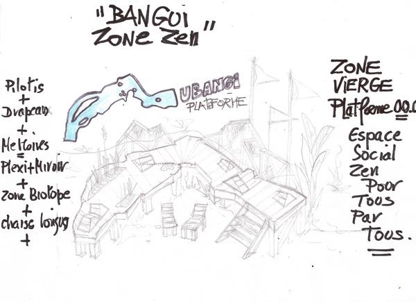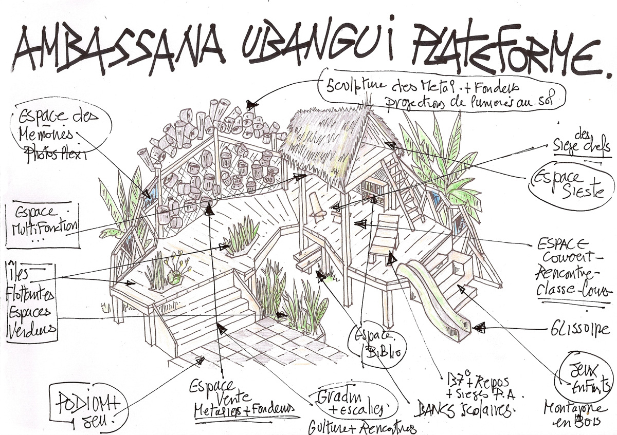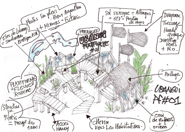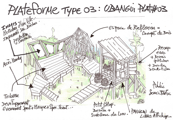 Ubangui Plateforme(s)#00+01+02+03 Ubangui Platerforme est un projet d’espace social zen multi-formats qui pourra être développé dans différents quartiers de Bangui. la forme des socles sur pilotis reprend à chaque fois le tracé de l’Ubangui, racine des populations locales. Ici, différents modules de structure sont dessinés et ont valeur de propositions pour déterminer dans chaque quartier les formes nécessaires et définitives, qui répondront le mieux aux besoins et à l’identité des lieux. Ces croquis seront montrés aux habitants des quartiers ciblés en Juillet, pendant ma seconde résidence, comme des exemples possibles pour développer les futures U-Plateformes, mais ils restent des exemples pour penser ensemble le projet définitif…plus d’infos: ici