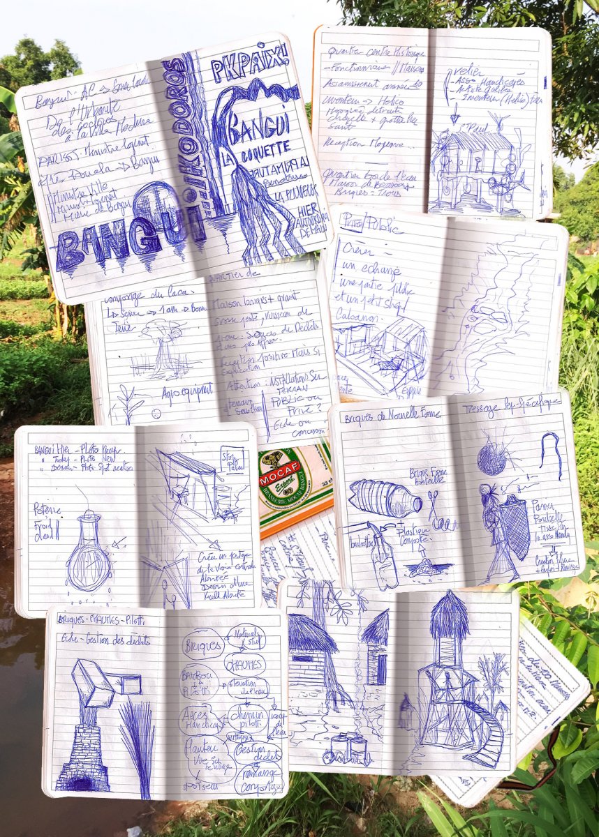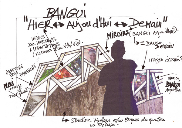 Première rencontre avec Bangui la Coquette, pour le projet « Mémoire d’une ville, Mémoire d’une Vie ». Bangui passée, Bangui ce jour, Bangui Demain ou comment peut-on proposer des projets qui vont emmener Bangui vers un futur plus serein, en réintroduisant les notions d’échanges, de partages et de lieux communs à travers les mémoires. La ville est une zone de mixité urbaine/rurale ou en dehors de l’hypercentre, les zones de circulation, de rencontres, de places sociales, et même de places privées/publiques ne sont pas clairement identifiées. L’accueil est très chaleureux, et les activités économiques et de vie sont présentes partout. Les quartiers, sous un look désordonné, sont en réalité très bien organisés, et l’utilisation des ressources, qu’elles soient naturelles ou de récupération, sont utilisées de manière utile et sans « gaspis ». La ville enclavée souffre de coûts d’importation élevés pour le ciment et les tôles, les constructions sont donc très souvent de granit pour les fondations, de briques de terres et de paillage,ce qui apporte un bénéfice économique et écologique assez important, et le maintien des emplois liés à la construction dans les quartiers. Ces premiers regards sur la ville sont donc positifs, mais la gestion des déchets et le lessivage des sols dû à la surexploitation des massifs forestiers entourant la ville, posent de réelles questions, et impliquent des directions pour les futurs projets. La ville étant aussi une ville très jeune, les lieux sociaux et de rencontres, comme les arbres à palabre ou les placettes de marché n’existent pas dans les quartiers de Bangui, le développement de la ville s’étant fait non pas sur des anciens villages mais plutôt sur des plans occidentaux. Les quartiers souffrent donc évidemment de lieux d’échanges, mais plus généralement de lieux dédiés: au travail, au jeu, aux rencontres, aux concerts, aux activités sportives…Les infrastructures culturelles et sociales au sein des quartiers restent à créer ou à recréer. Le projet est sans doute là.