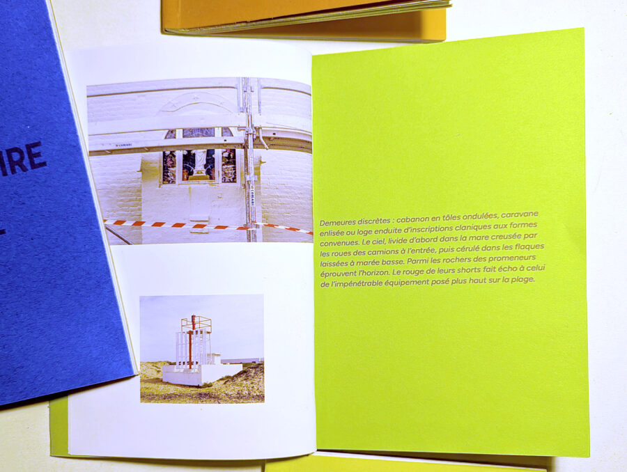 Demeures discrètes : cabanon en tôles ondulées, caravane enlisée ou loge enduite d’inscriptions claniques aux formes convenues. Le ciel, livide d’abord dans la mare creusée par les roues des camions à l’entrée, puis cérulé dans les flaques laissées à marée basse. Parmi les rochers des promeneurs éprouvent l’horizon. Le rouge de leurs shorts fait écho à celui de l’impénétrable équipement posé plus haut sur la plage.