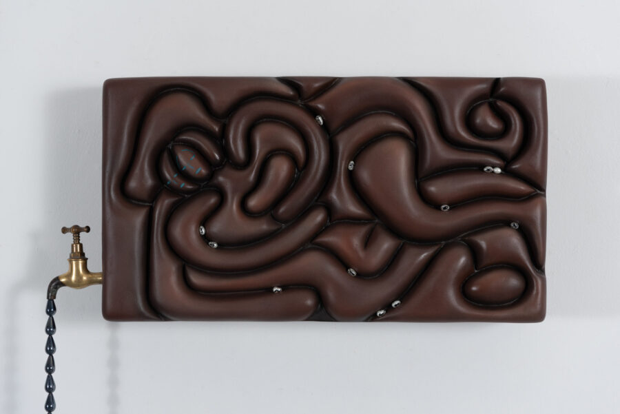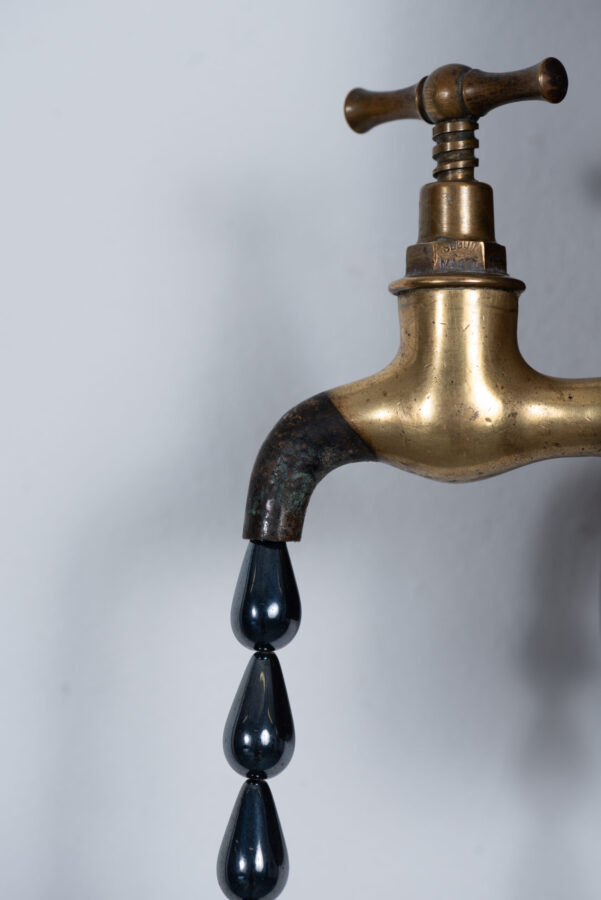 , «Une vie terrestre: les doutes sont des trésors.», 2025, peinture, fil, perles, robinet en laiton, 60 x 10 x 160 cm, Le Cygne et l'Etoile, W Pantin, Pantin, photographie : © Romain Moncet