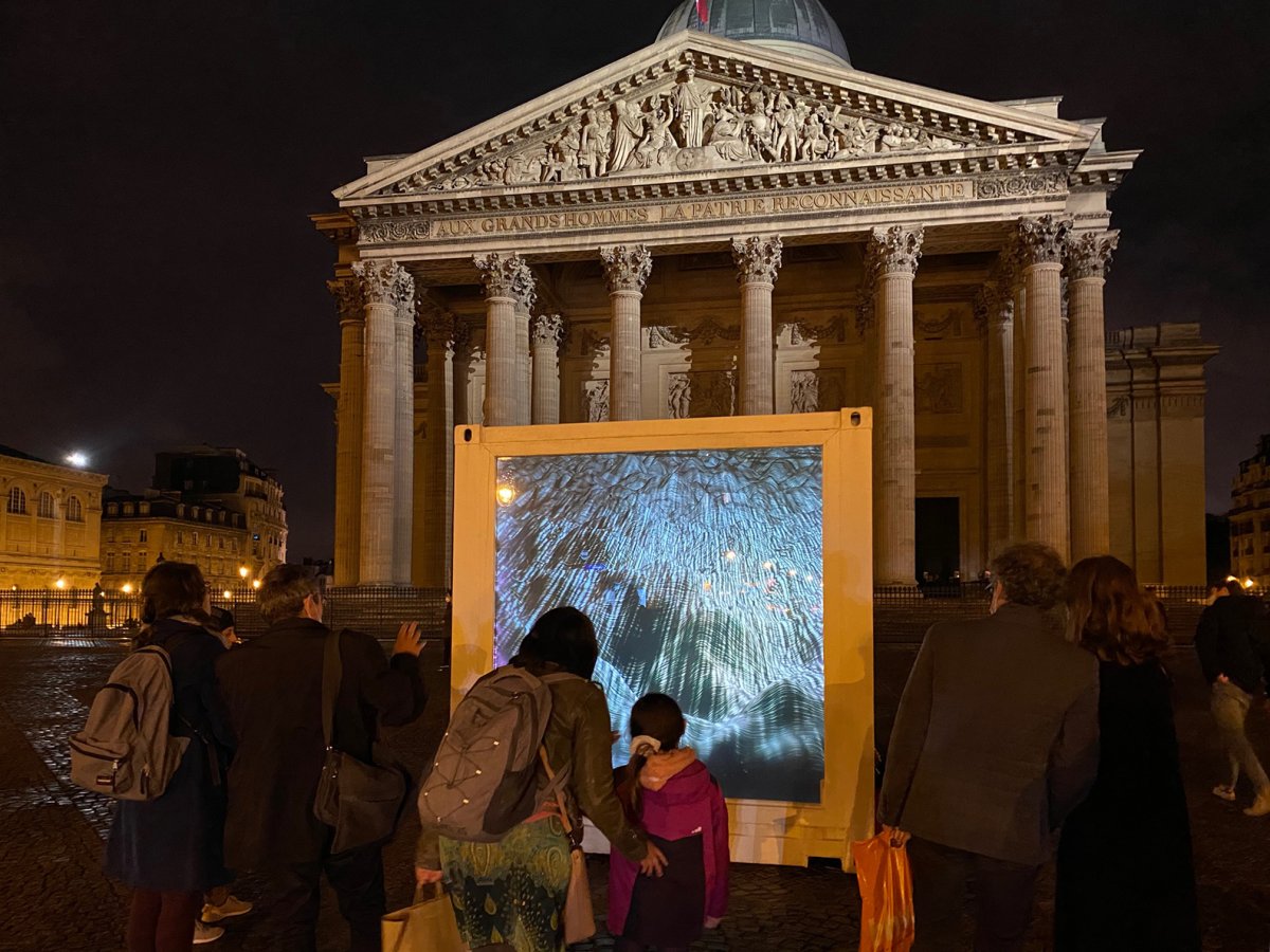 Un travelling parcourt un paysage dessiné d’une façon classique, composé de hachures noires et blanches. Le déplacement évoque le survol par drone d’une zone de relief. L’esthétique de l’image semble pourtant décalée, désuète, voire datée. Une contradiction surgit entre l’origine numérique, artificielle de ces reliefs et leur apparence dessinée et révèle un paradoxe entre l’espace virtuel technologique et sa représentation rappelant le classicisme d’une gravure ancienne. La vidéo parait intemporelle questionnant les attentes face à ces deux techniques habituellement antagonistes et qui cependant nous transportent, toutes deux, vers des espaces mentaux ouverts et infinis.