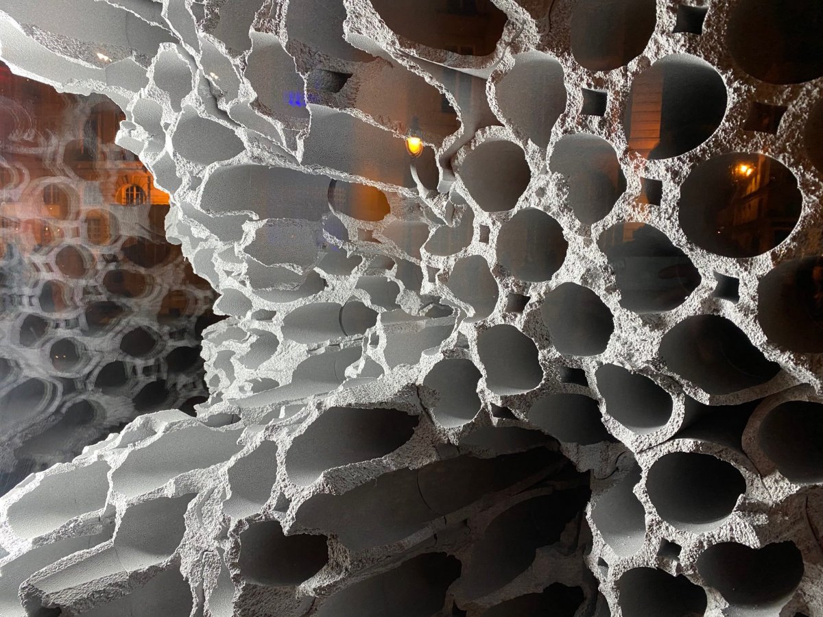 A première vue, la totalité de l’espace intérieur du container est occupée par une étrange matière grise ressemblant à de la roche. On découvre ensuite une cavité. Ce fragment de paysage qui s’apparente à une grotte est contenu derrière la vitre du container. Il semble extrait d’un ensemble plus vaste à l’échelle d’un paysage. Les alvéoles circulaires régulières révèlent l’origine artificiel de cet échantillon à l’apparence minérale. La nature de cet élément est par conséquent difficile à cerner. Enigmatique, ce fragment ne délivre que peu d’indices absorbant ainsi tous les possibles. Cet espace pourtant clos nous ouvre un territoire à explorer.