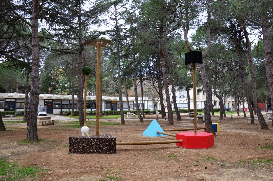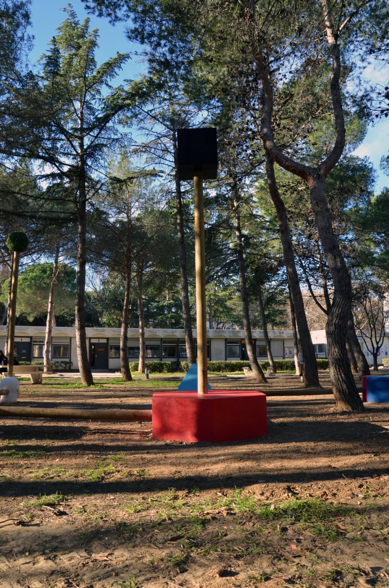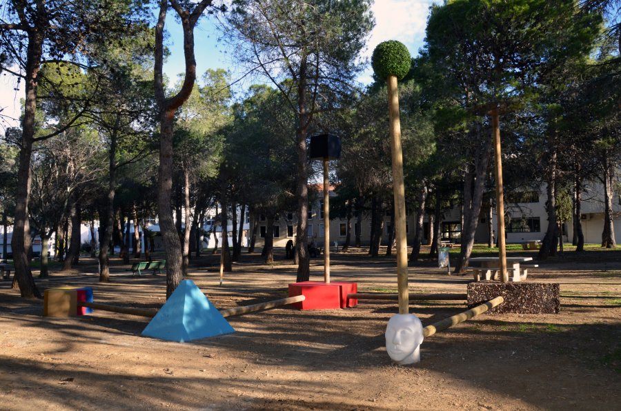 Via Unita est une constellation composée de huit formes géométriques interconnectées par des rondins de bois. A la manière d’une carte mentale, cette œuvre s’organise en réseau où chaque connexion évoque un pôle enseigné au sein de l’Université Via Domitia. Ces différentes formes géométriques telles que le disque, le cube ou encore la pyramide symbolisent, désignent et révèlent quelque chose mais aussi alimentent notre imaginaire. L’idée est de mettre en lumière les liens qui existent entre un concept, une idée, et les informations qui leur sont associées. En suivant le cheminement de la pensée, cette installation mène une réflexion sur nos imaginaires collectifs.Imposante mais parcellaire, Via Unita participe à une réflexion sur la transmission des savoirs en transformant l’espace environnant.