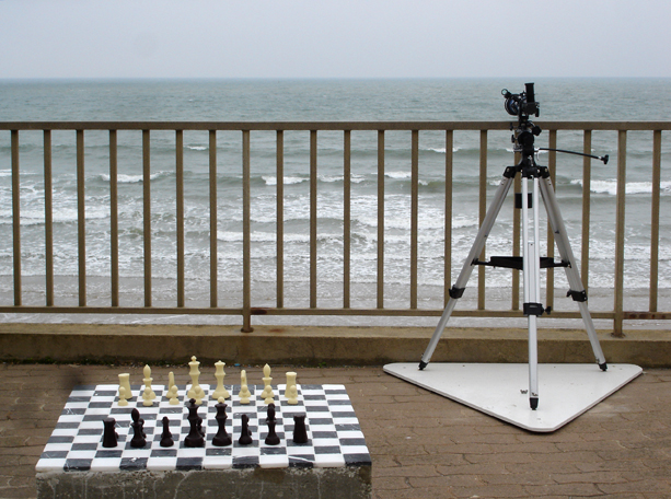 Il m’a semblé important d’ajouter un élément en tout dernier lieu (face à la mer- tout au bord de la terrasse, légèrement décalé par rapport à la table de jeu) comme une ponctuation au dispositif, pour prolonger davantage la perspective provoqué par le damier. La position d’une longue vue/télescope tout au bout de la terrasse pour mirer à loisir le lointain (la lune, le ciel étoilé, les nageurs, les bâteaux et le Pain de sucre à Rio De Janeiro me souffle le directeur de la Villa, M.Andreys …) prolonger le regard, prolonger le mouvement…