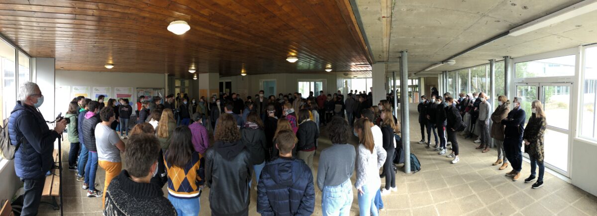 Sur le principe de la méditation par la voix, une résonance, à la fois vécue profondément en soi et partagée collectivement. Après quelques séances d’ initiation, 140 voix (étudiants et personnels du lycée Nature à la Roche-sur-Yon) ont vibré ensemble pendant 15 minutes sur le temps de la pause méridienne.