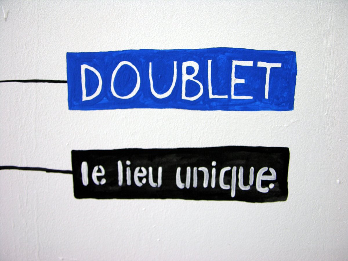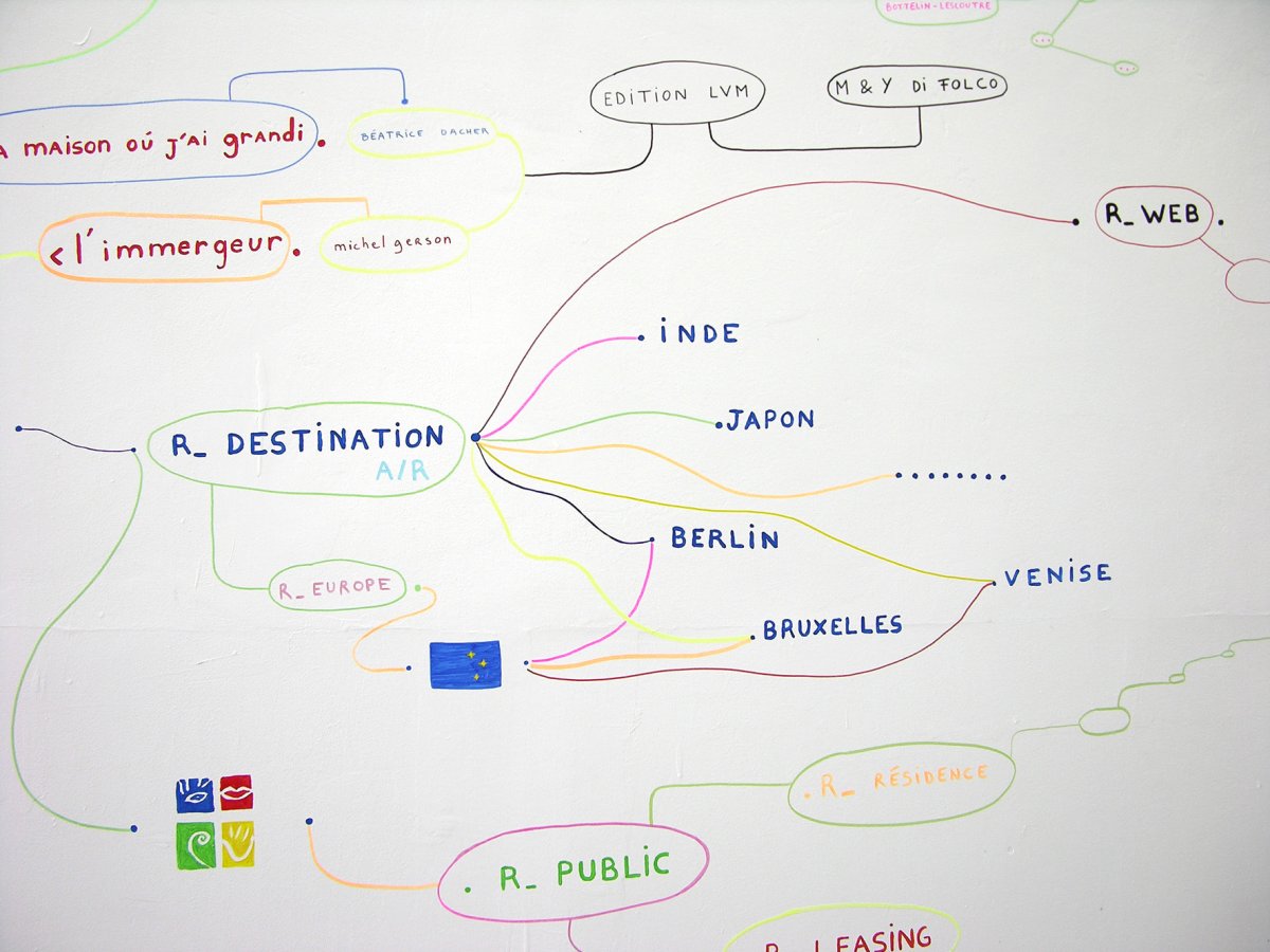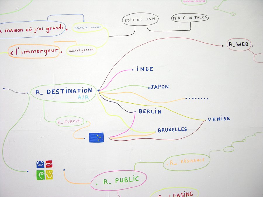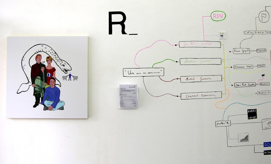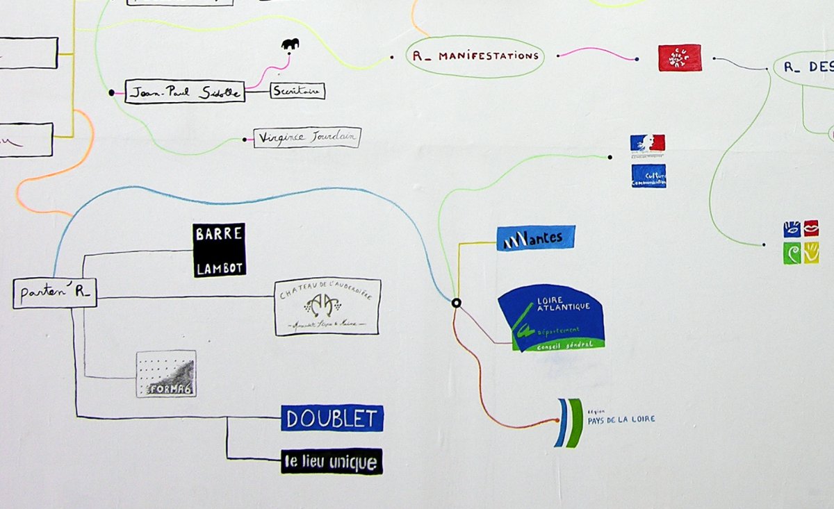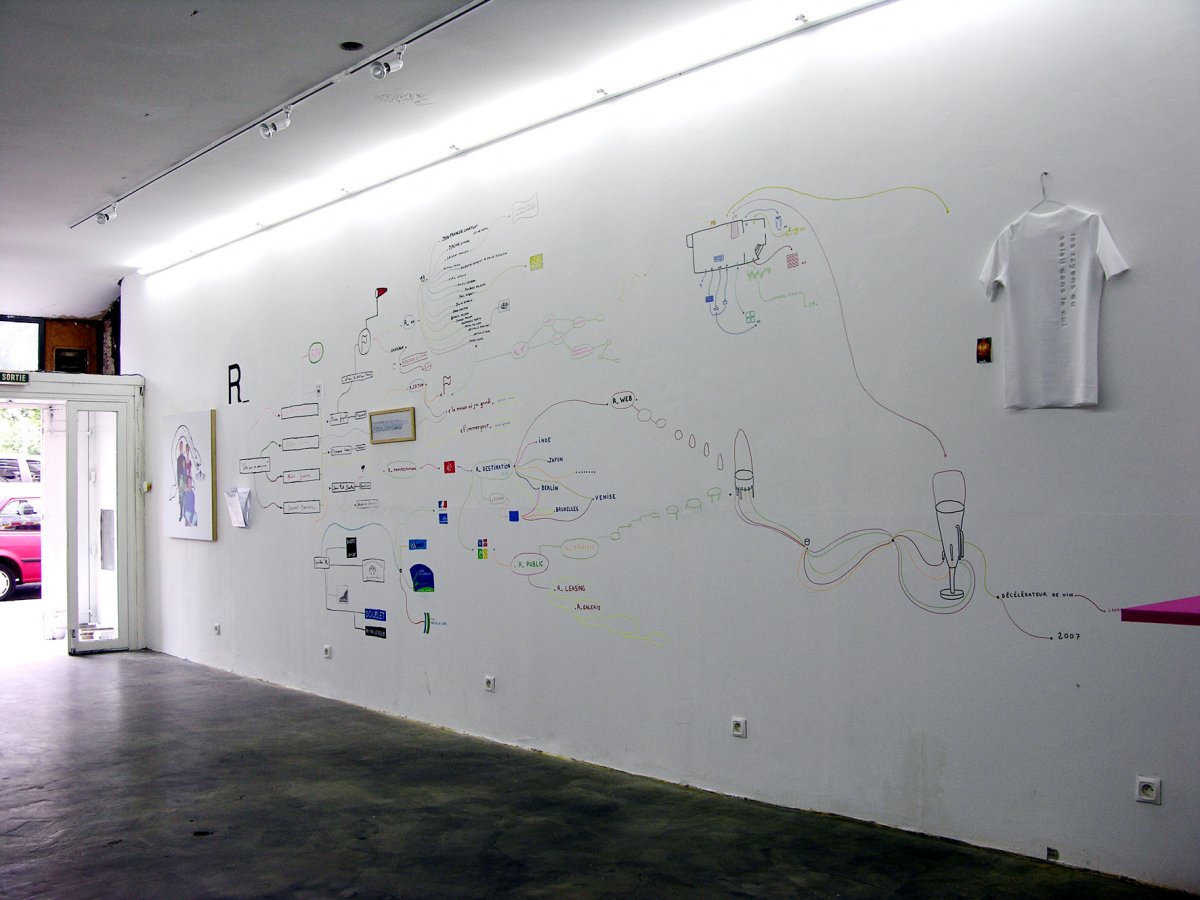 Dessins sur le mur de la galerie des différentes activités du collectif R_, des Logos des partenaires, le plan de l’exposition…
