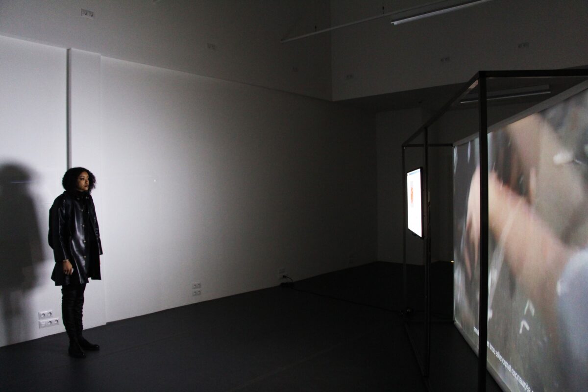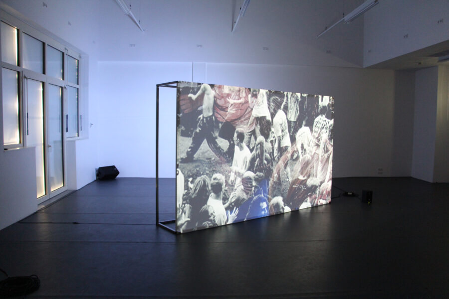 we were so numerous est constitué de deux films installés dos à dos. Au verso, le premier film est constitué uniquement de films d’archives du phénomène pogo. Il est projeté sur une toile de quatre mètres de large, tendue sur une structure en métal. Au verso, le second film, diffusé sur un écran plat, se trouve placé au centre de l’image projeté au recto. D’un côté nous voyons le premier film seul, de l’autre côté nous voyons les deux films en superposition.