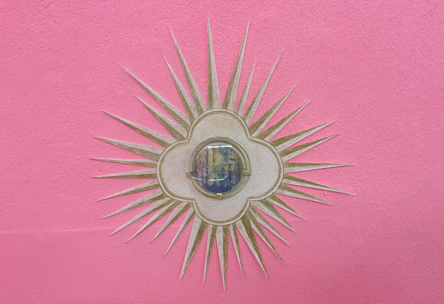 Les hosties sont recouvertes d’images issues de peintures réalisées en 2022 et 2023, représentant des forêts incendièes. Chaque hosties représentent une partie de la forêt entrain de disparaître, donnant un aspect abstrait et parcellisé de l’image. Elles reposent sur un demi-cercle évoquant un soleil vert, un autel surmonté d’un fragile ostensoir en papier.