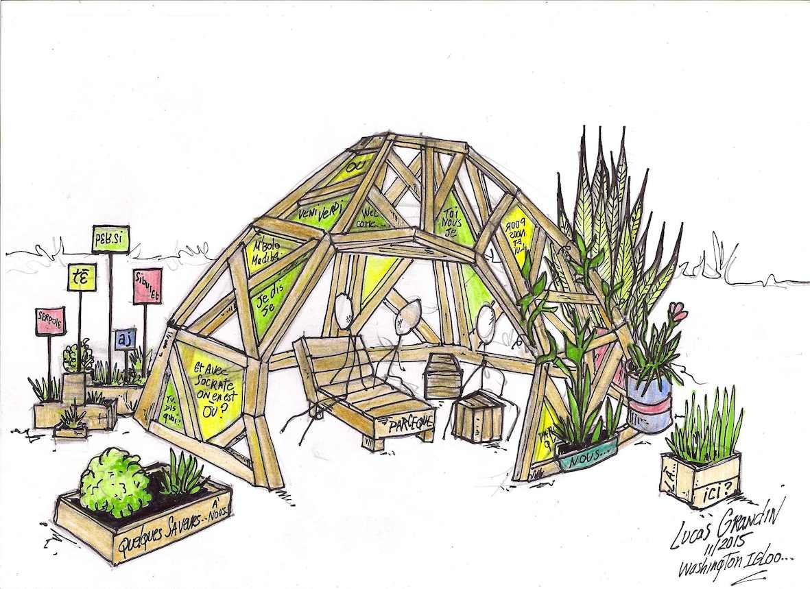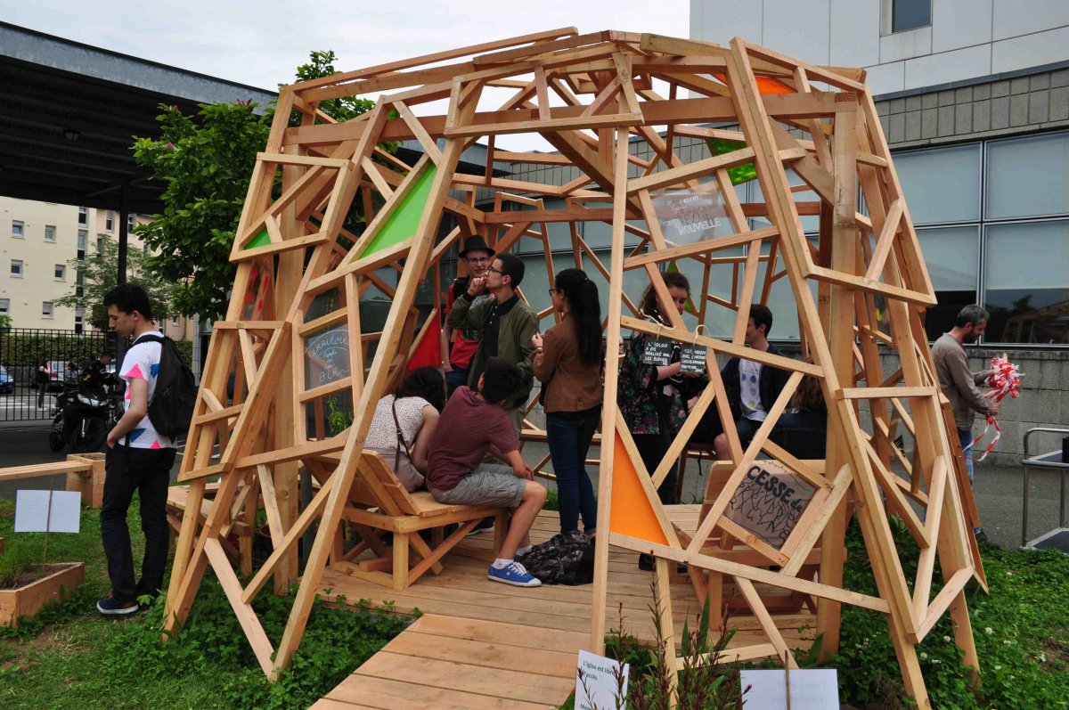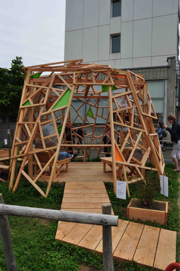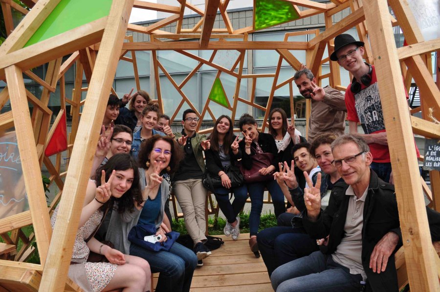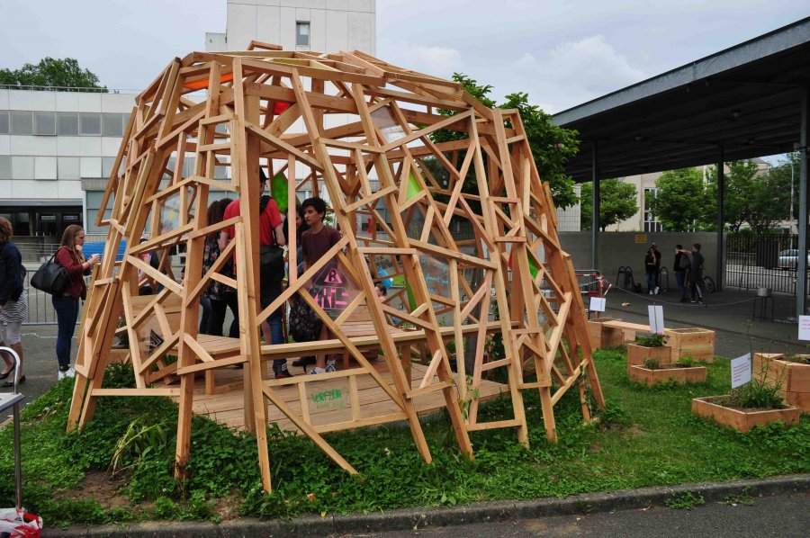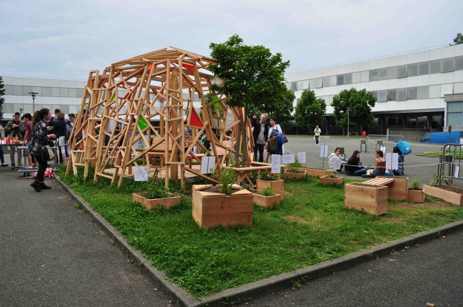 Workshop Construction Lycée Touchard/Washington du Mans, Avec les classes de 1S1 et 1BSEN. Oeuvre definie et construite avec les élèves autour d’une idée d’espace intime végétal et poétique dans ce grand lycée à l’architecture très minérale du Sud de la ville.