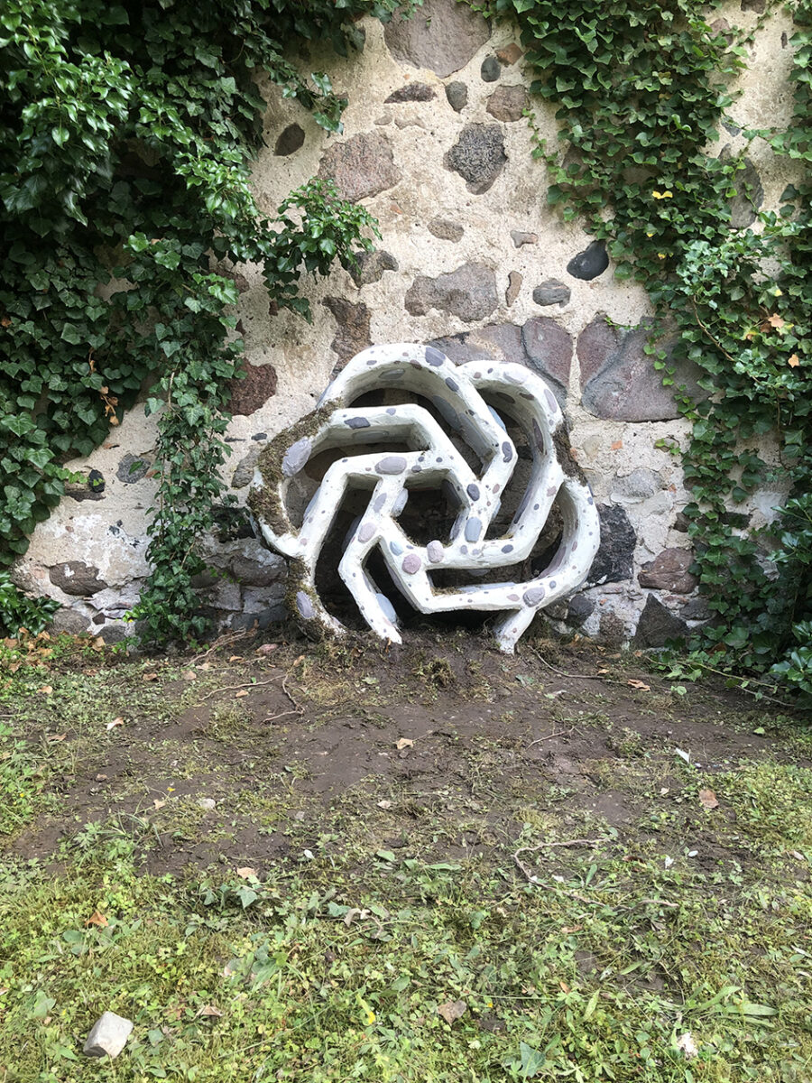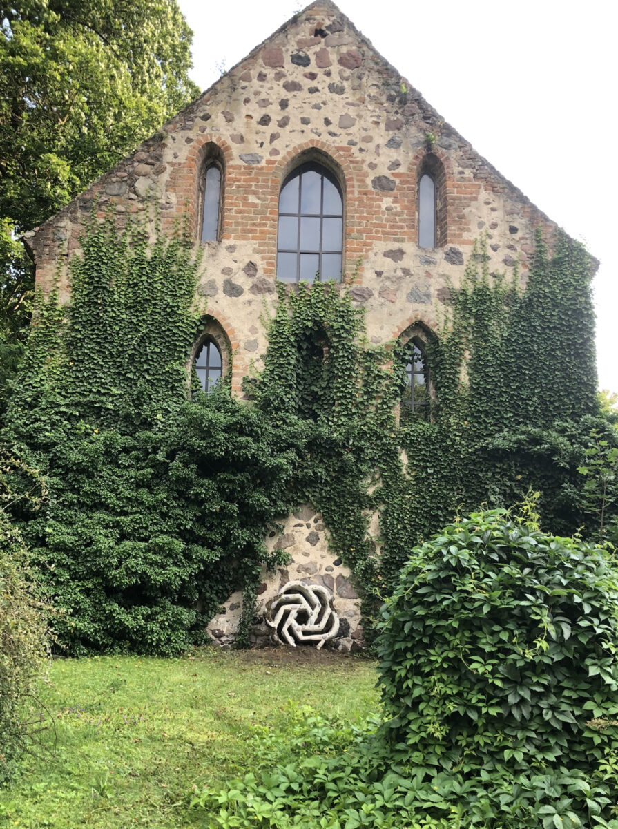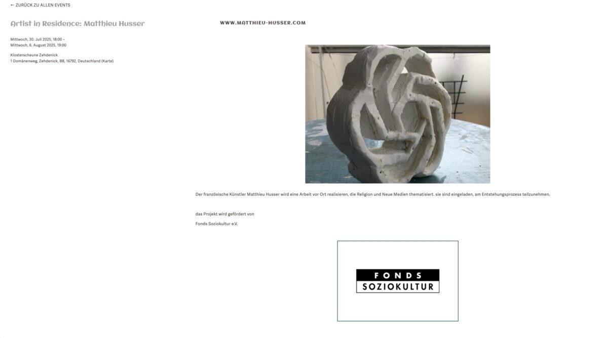 L’artiste français Matthieu Husser a installé, en août 2025, une sculpture temporaire sur le pignon de la grange du monastère, qui, au premier regard, semble être une pierre gothique présente depuis des siècles. Il s’agit d’une spirale rappelant le réseau ornemental des vitraux gothiques ou encore une clé de voûte d’un édifice médiéval. En réalité, beaucoup reconnaîtront en l’observant de plus près un signe très contemporain, symbole d’un bouleversement extrême de notre monde : c’est l’emblème de l’intelligence artificielle ChatGPT. Le titre de l’œuvre, V.G.U.S., signifie « parler avec un transformateur génératif pré-entraîné ». Le nombre 1250 ne désigne pas un numéro de série, mais l’année de fondation du monastère de Zehdenick.Nous sommes certes déjà habitués, depuis des décennies, à de nombreux changements radicaux liés aux techniques numériques. Mais l’intelligence artificielle (IA) est, à bien des égards, encore plus révolutionnaire que tout ce que nous avons connu jusqu’ici dans ce domaine. Elle ouvre des possibilités insoupçonnées, tout en apparaissant pour beaucoup comme une menace considérable. Les personnes créatives et intellectuelles doutent parfois que leurs compétences soient encore utiles. D’autres vont jusqu’à remplacer leurs contacts sociaux par l’IA. ChatGPT représente une véritable rupture d’époque dans l’histoire de l’humanité, dont nous n’avons pour l’instant qu’une idée très vague des développements futurs. Matthieu Husser a déjà, en France, intégré des symboles de l’ère numérique dans des églises historiques, comme s’il s’agissait de reliques authentiques provenant de temps immémoriaux. Dans son travail à Zehdenick, il reprend également la structure des murs en pierres de champ. Ce faisant, il questionne non seulement notre perception et notre idéalisation des bâtiments médiévaux, mais aussi notre conception de la religion. La religion est souvent perçue comme immuable, attachée à la tradition. Pourtant, presque toutes les croyances se distinguent par une grande capacité d’adaptation à de nouveaux besoins sociaux ou spirituels. Le christianisme a été – et demeure – un maître dans l’art d’approprier et de réinterpréter des signes étrangers à son profit. En cela, il ressemble au nouvel univers qu’est Internet, lequel, en un temps très court, a déjà traversé plusieurs phases de développement et produit sans cesse de nouvelles formes et symboles, tout en conservant sa structure de base. Certains chercheurs discutent même de la question de savoir si ChatGPT peut constituer un substitut à la religion pour l’être humain. On affirme que le cerveau d’utilisateurs assidus réagit, à la vue du signe de ChatGPT, de la même manière que celui des croyants devant une croix. ChatGPT instaure, par la communication, une confiance dans le monde, tout comme les religions le font. Mais l’IA peut-elle vraiment remplacer une religion en nous donnant des repères de vie ? En ajoutant le signe de ChatGPT sur le mur de la vieille grange du monastère – comme si l’on avait placé là un vestige d’une ancienne église détruite – Matthieu Husser ne se contente pas de poser la question de savoir si ChatGPT remplace les religions anciennes. Il fait aussi référence à la transformation des symboles et à l’appropriation de signes et de structures de communication par l’Église chrétienne. La tromperie historique consistant à faire passer ce signe pour un ancien élément architectural nous amène également à réfléchir à notre perception : qu’est-ce qui est authentique, qu’est-ce qui est faux ? Quelle est la valeur de la tradition religieuse héritée, et peut-elle vraiment être remplacée aussi facilement ?