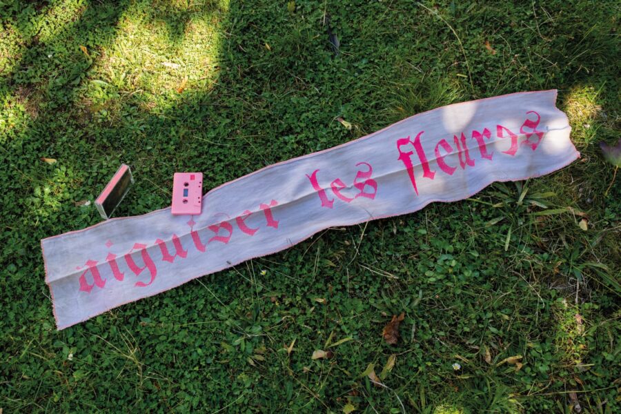 De là nous avons créé un zine audio et textile composé d’un texte en trois parties — Jo, Le phytoplacage et Eroscopie —, de créations sonores réalisées à partir de sons glanés et mixés durant la résidence, et d’une piste cachée. Les trente cassettes audio sont issues du détournement de la collection complète des Martines lu par Chantal Goya. L’effacement de celles-ci devient ici un geste d’écriture: en gommant la parole de Chantal Goya, c’est tout un imaginaire genré et normé qui s’efface pour laisser place à d’autres récits et expériences.